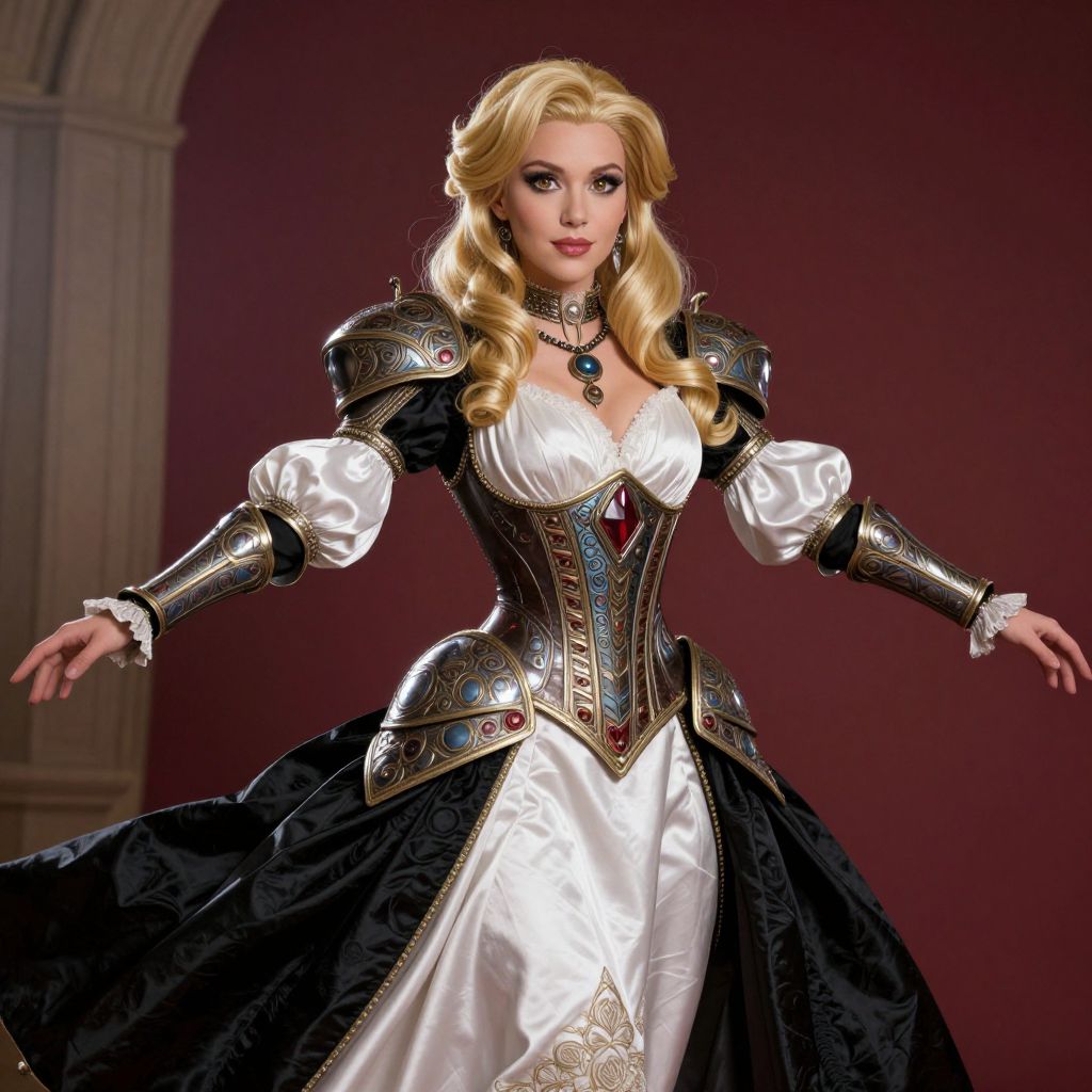 A digital illustration of a blonde, fair-skinned woman with wavy hair, dressed in an ornate, medieval-style gown. The gown features a black, intricately embroidered bodice with silver armor-like shoulder plates, puffed white sleeves, and a flowing white skirt with black trim. She wears a blue gemstone necklace and matching earrings. Her expression is confident, and her arms are slightly outstretched. The background is a deep red with a partial, arched, beige stone wall on the left. The overall style is fantasy-inspired with a focus on detailed, regal attire.