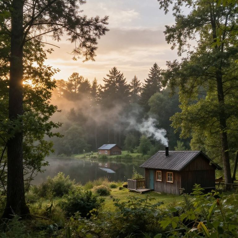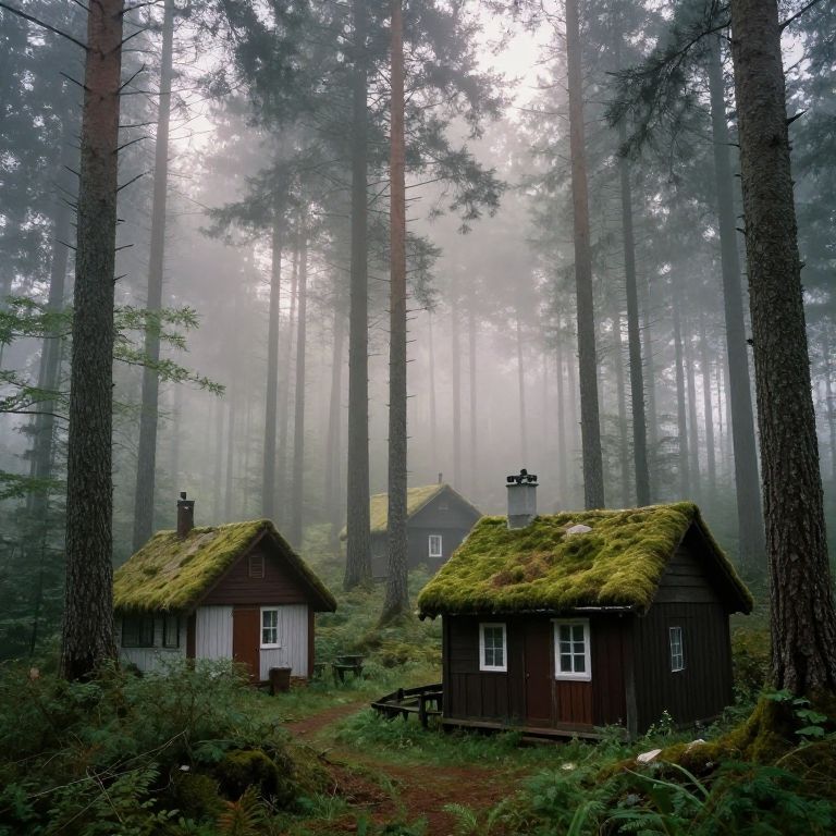 Photograph of a misty forest with three small, rustic wooden cabins. The cabins have moss-covered roofs and white-framed windows, with two in the foreground and one slightly hidden in the background. Tall, slender pine trees dominate the scene, their trunks rising vertically, creating a dense canopy. The forest floor is covered in green foliage and a narrow dirt path leads between the cabins. The mist adds a mysterious, ethereal quality, softening the light and creating a serene, almost magical atmosphere.