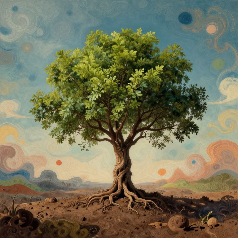 Semilla in an artistic surreal scene, transforming into a tiny tree in mid-growth, blending seamlessly with abstract earth and sky elements, intricate details with vibrant colors and fantasy-inspired textures