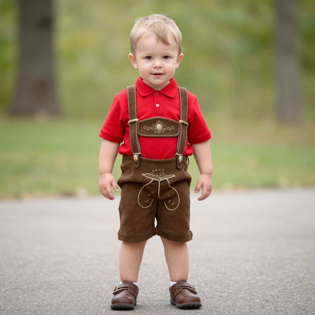 Photograph of a blonde, fair-skinned toddler standing on a paved path in a grassy park. The boy wears a red polo shirt, brown leather suspenders with intricate gold embroidery, and matching brown shorts with decorative laces. He also has brown shoes with black soles. The background is blurred with green grass and tall trees. The toddler looks directly at the camera with a slight smile, his hands resting by his sides. The lighting is natural, highlighting his outfit and expression.