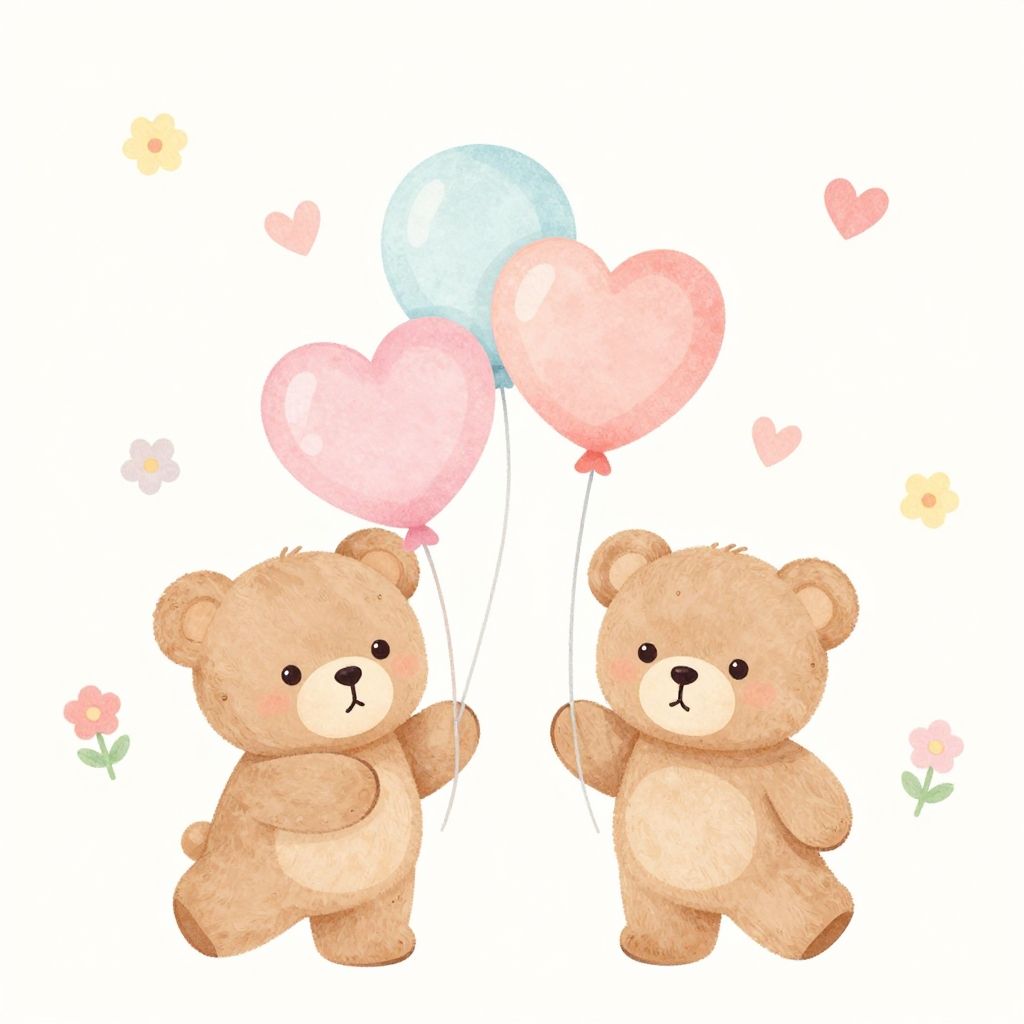 Cute digital watercolor of two fluffy brown teddy bears holding pink and blue heart-shaped balloons, surrounded by small hearts and flowers.