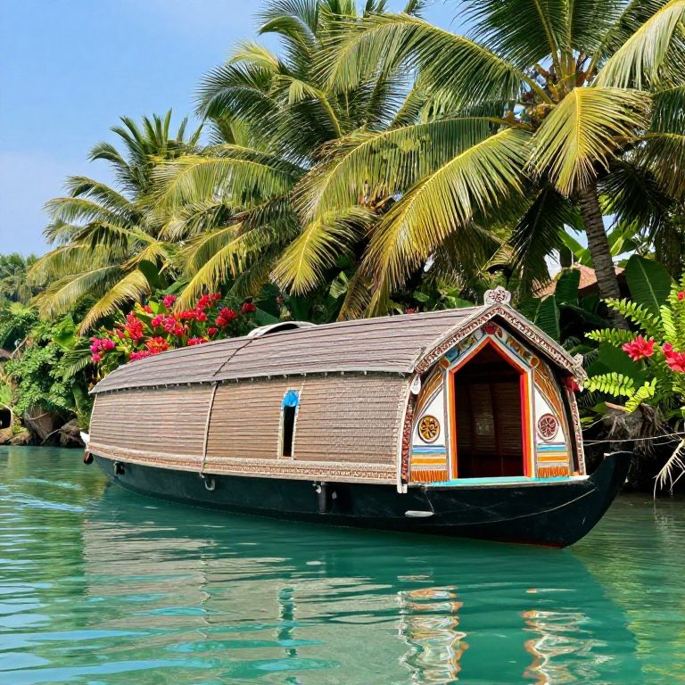 Traditional houseboat with ornate carvings and colorful fabrics, floating along a tropical river lined with palm trees and exotic flowers, clear turquoise water, bright sunny day, vibrant culture and nature blend seamlessly in idyllic setting.