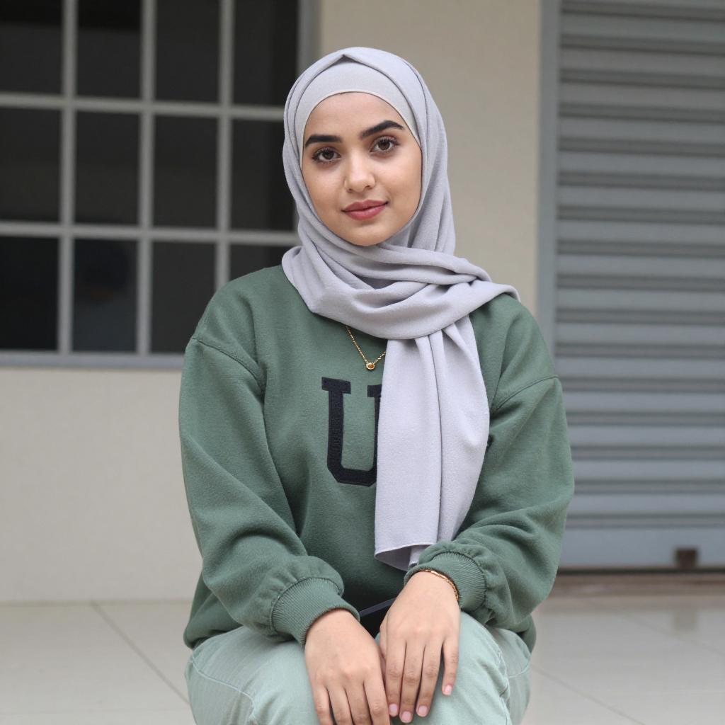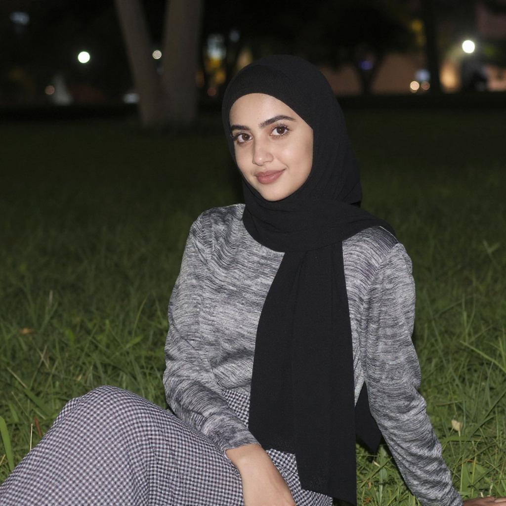 Photograph of a young woman with fair skin and black hijab, sitting on grass at night. She wears a gray, marbled long-sleeve top and black-and-white checkered pants. Trees and blurred lights in the background. She looks directly at the camera with a slight smile.