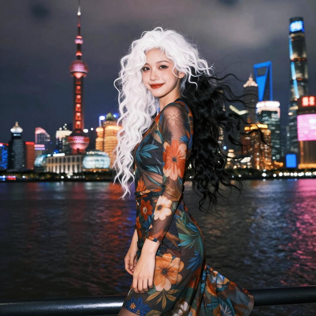 Realistic, photorealistic, masterpiece, best quality, dark shot, (photo of portrait:1.2), cowbody shot, 1girl, (white hair:1.3), long curly hair, solo, (smile:0.8), looking at viewer, long black hair, ([:see-through:4]:1.2) (colorful:1.2) cns_dress, (floral print:1.2), standing by a river, dynamic pose, (shanghai:1.2), water, colorful cloud, incredible beautiful sky, netural lighting, dynamic Angle, neon, Backlit, bokeh, Chiaroscuro, (freckles:0.9)