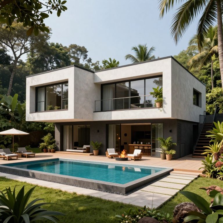Photograph of a modern, two-story white concrete house with large, black-framed windows. The house features a balcony on the upper floor with potted plants. The lower level has an outdoor patio with lounge chairs, a white umbrella, and a small fire pit. A rectangular swimming pool with clear blue water is centered in the foreground, bordered by a stone deck. Lush greenery and tall palm trees surround the house, with a staircase on the right leading to the upper floor. The sky is clear and blue.