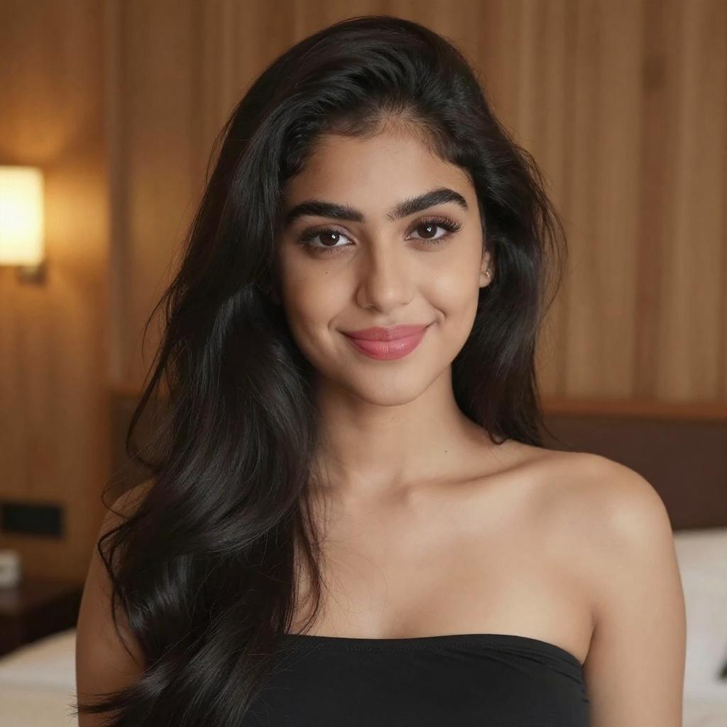 Photograph of a young South Asian woman with long, wavy black hair and medium brown skin. She has arched, dark eyebrows, large brown eyes, and full pink lips, smiling slightly. She wears a strapless black top, revealing her shoulders and collarbones. The background features a softly lit room with wooden paneled walls, a bed with white sheets, and a wall-mounted lamp. The lighting is warm, highlighting her features. Her overall appearance is elegant and natural.