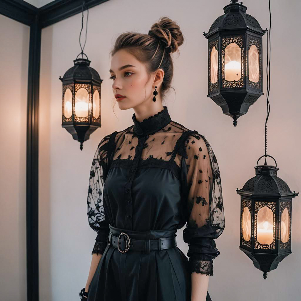 Portrait of a lean young woman with a messy bun hairstyle wearing a black funeral-style outfit featuring lace details and leather elements. She accessorizes with minimal black earrings and stands near black ornate lanterns illuminated with soft lighting against a pastel-colored background.