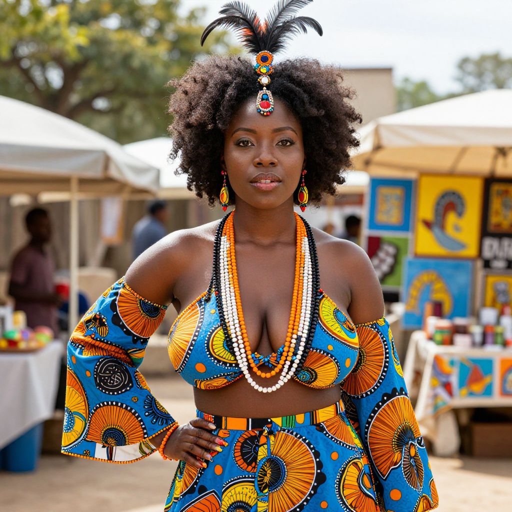 A confident Black woman with a vibrant loose afro hairstyle, wearing a bold retro 1970s African-inspired costume featuring bright beads, flowing fabrics, and a feathered headpiece, standing in a sun-drenched outdoor market with colorful stalls and vibrant local art in the background.. The woman has big breasts and cute face
