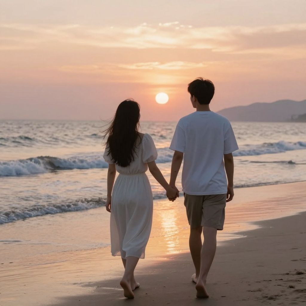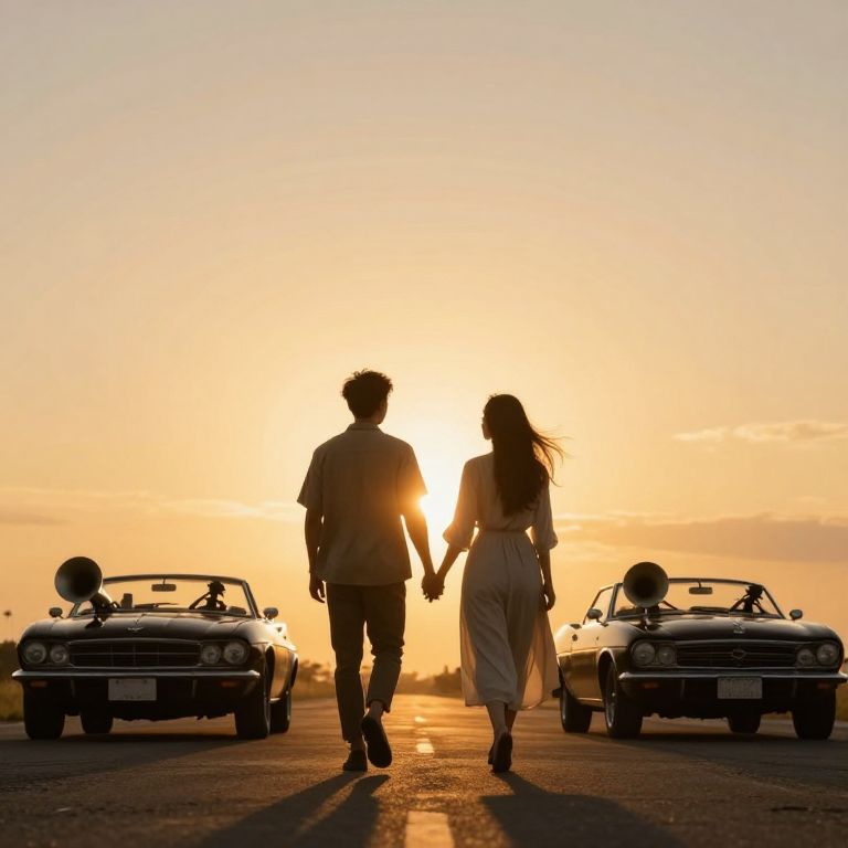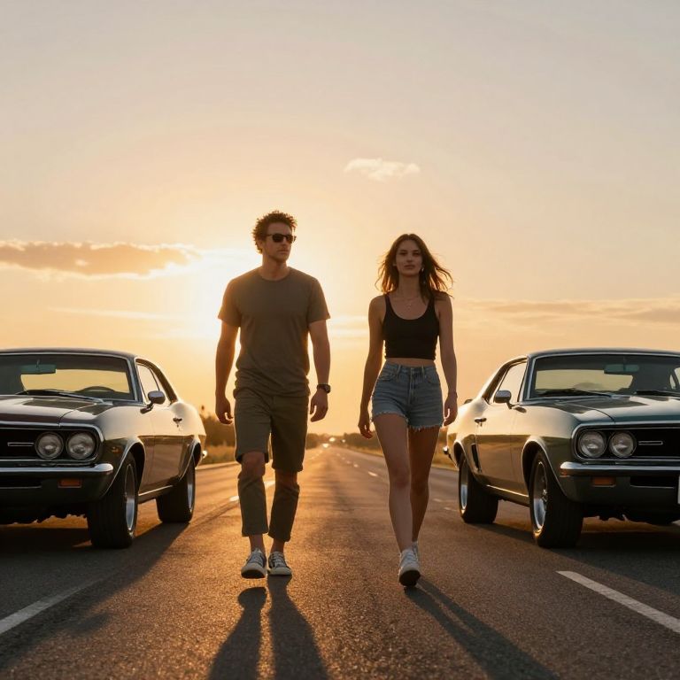 Under the golden embrace of a setting sun, two souls walk hand-in-hand toward an uncertain horizon, their journey embodying the duality of freedom and fate, as the roaring engines of classic cars echo the relentless pulse of destiny behind them.