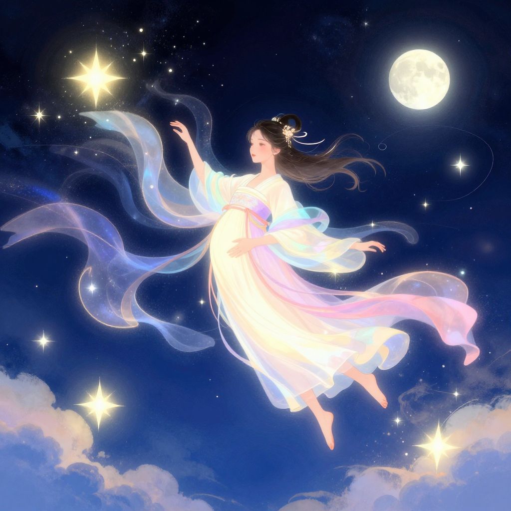 Mythology visualization of a celestial river flowing through the heavens, adorned with shimmering stars and floating islands, gods and spirits interacting on ornate bridges, blending surrealism with fantasy, soft pastel color palette with glowing highlights.
