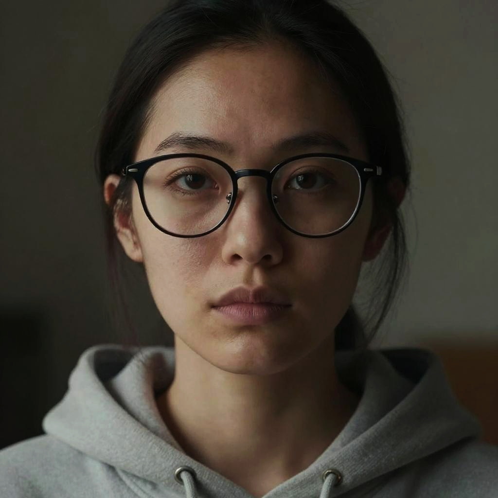 Photograph of a young Asian woman with fair skin and dark, straight hair pulled back, wearing black, thick-rimmed glasses. She has a serious, neutral expression and is dressed in a light gray hooded sweatshirt. The background is blurred and dark, focusing attention on her face. The image has a soft, natural light that highlights her facial features and the texture of her hoodie. The style is realistic and slightly moody, with a shallow depth of field.