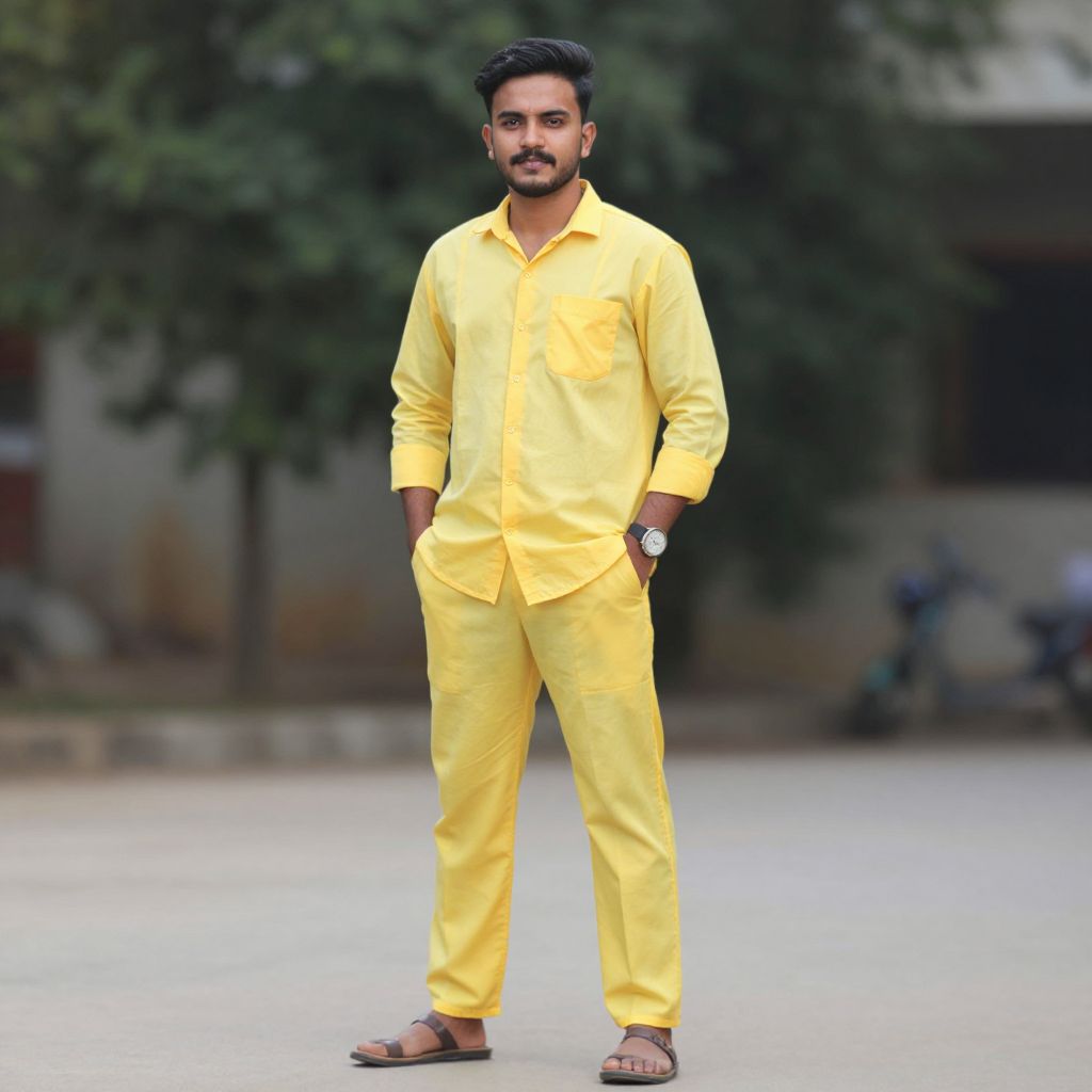 Yellow shirt costume, male focus, 1boy, shirt, outdoors, facial hair, pants, hands in pockets, shoes, blurry, watch, full body, collared shirt, blurry background, wristwatch, looking at viewer, day, mustache, standing, solo