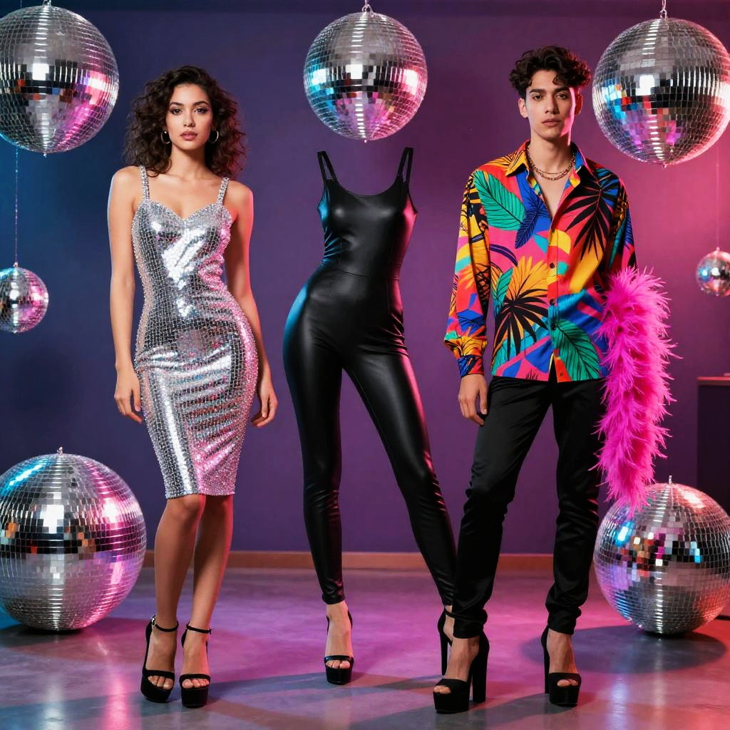 Disco dress code showcasing glittery bodycon dresses, spandex jumpsuits, funky patterned shirts, platform heels, and feather boas set against a backdrop of swirling disco balls and vibrant club lighting