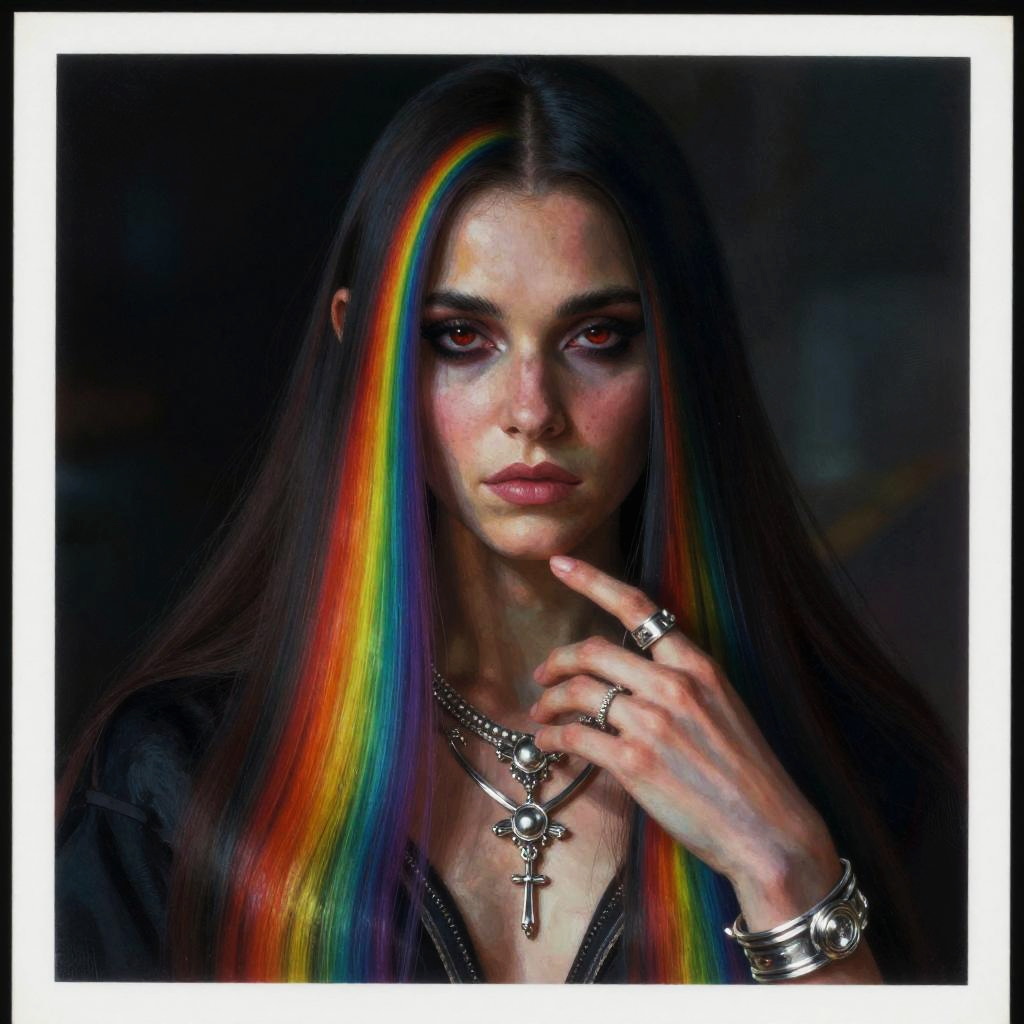 Concept art f/1.4, square image, close up film photo, portrait of a Ogre, rainbow long, dark red eyes, silver jewelry, elegant pose, atmospheric lighting, cinematic composition, detailed, summer, mood, Disaster . digital artwork, illustrative, painterly, matte painting, highly detailed