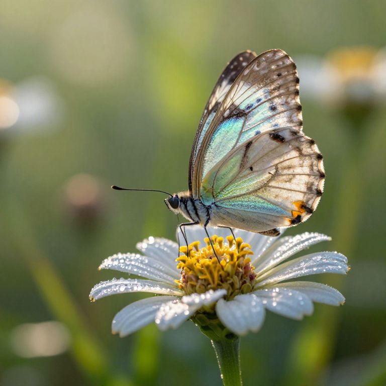 Brillante butterfly landing on a glistening dewy flower, wings translucent with iridescent patterns sparkling in early morning sunlight, lush garden background with soft focus, photorealistic macro image capturing delicate beauty and brilliance.