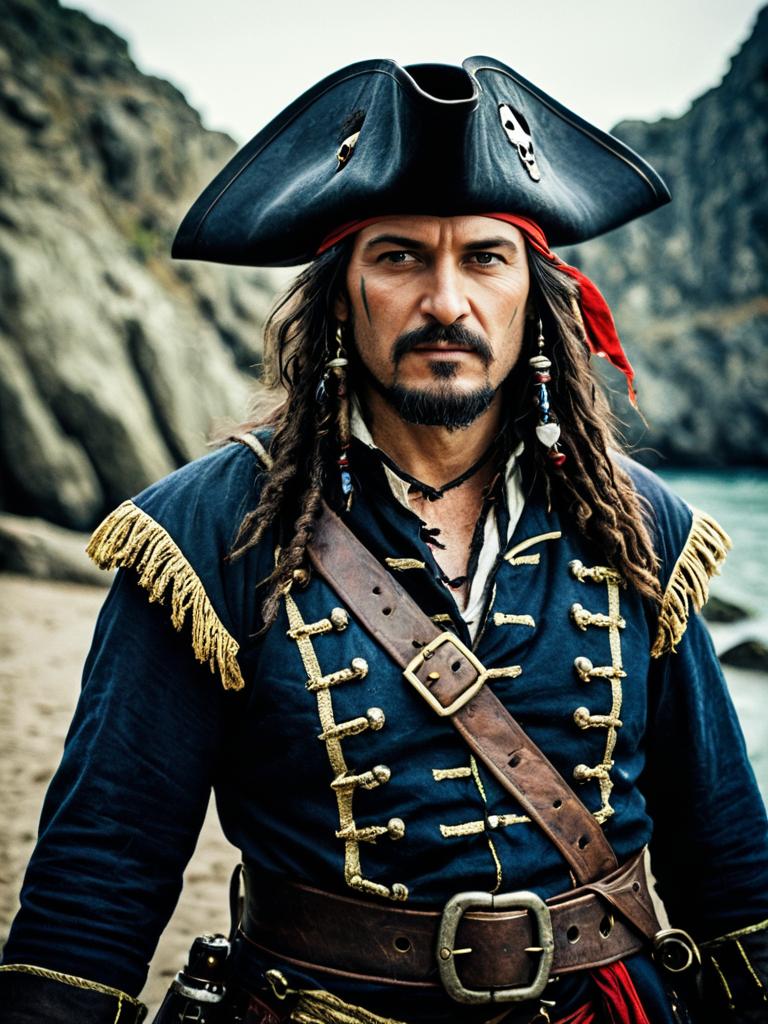 Photorealistic portrait of a man dressed in a detailed pirate costume featuring a tricorn hat with skull and crossbones emblems, long dreadlocked hair, a red bandana, and a black coat with gold buttons. The man has a serious expression and a well-groomed beard, embodying cinematic realism in a rugged cosplay style.