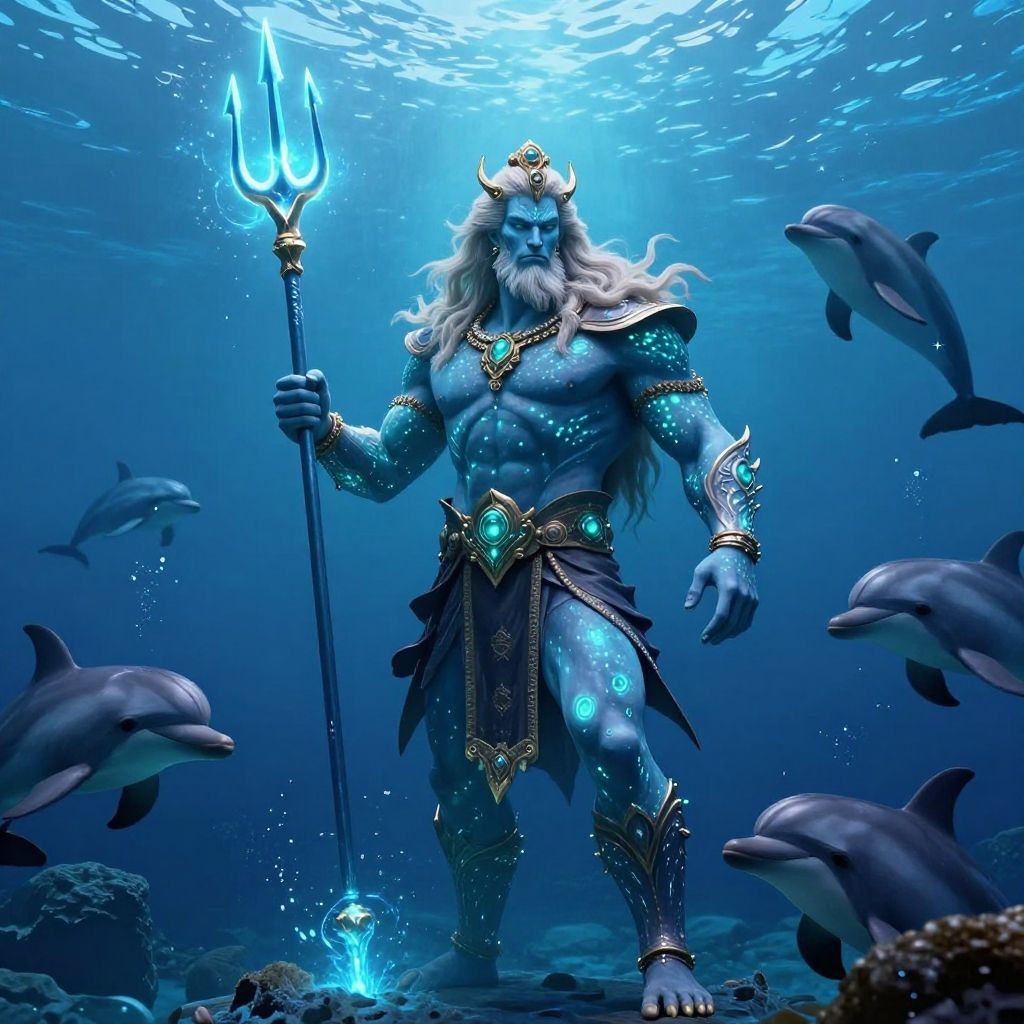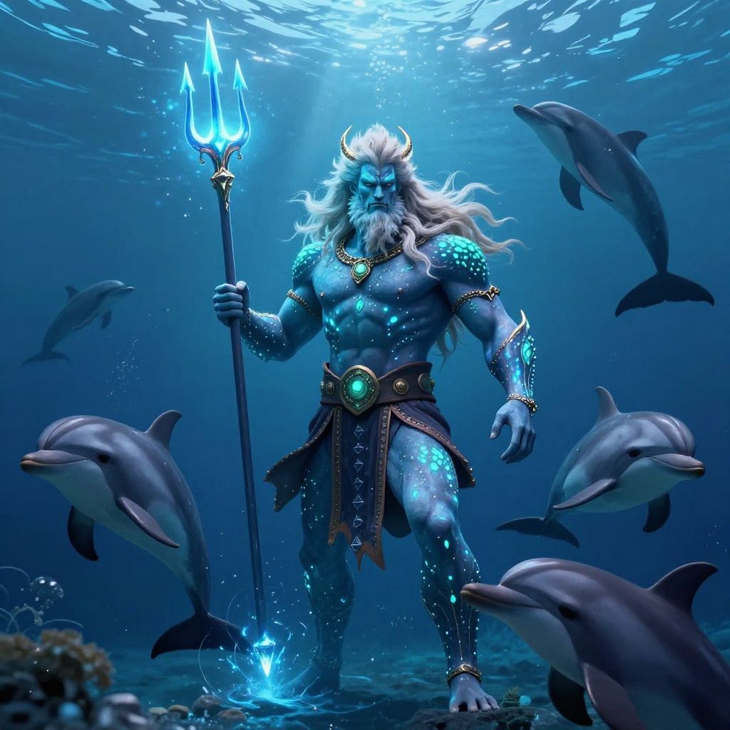 Poseidon's appearance portrayed as a god of the sea with blue-green skin, bioluminescent markings, a majestic trident glowing with magical power, surrounded by dolphins and whales in a deep underwater realm