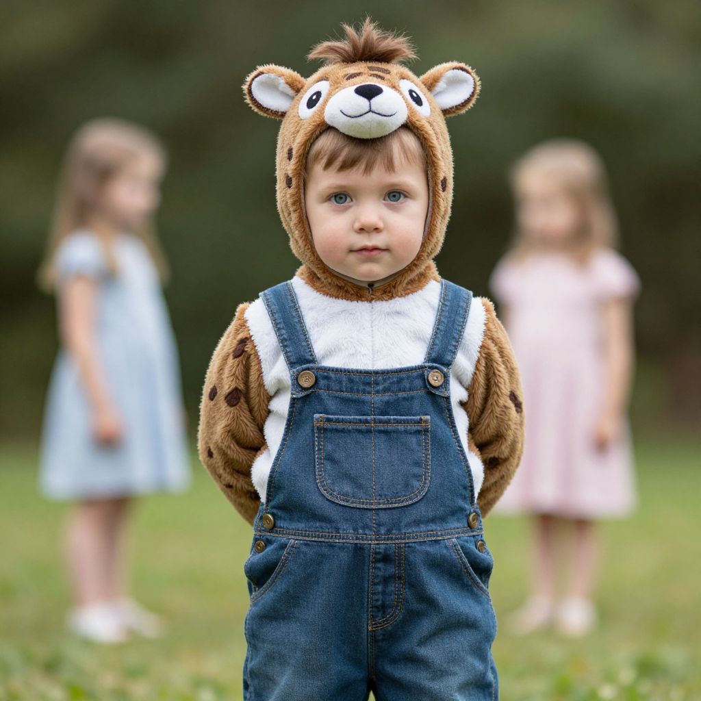 Infant bunting costume, solo, brown hair, looking at viewer, animal costume, realistic, arms behind back, male focus, outdoors, overalls, 1boy, 1girl, blurry background, blurry, grass, blue eyes