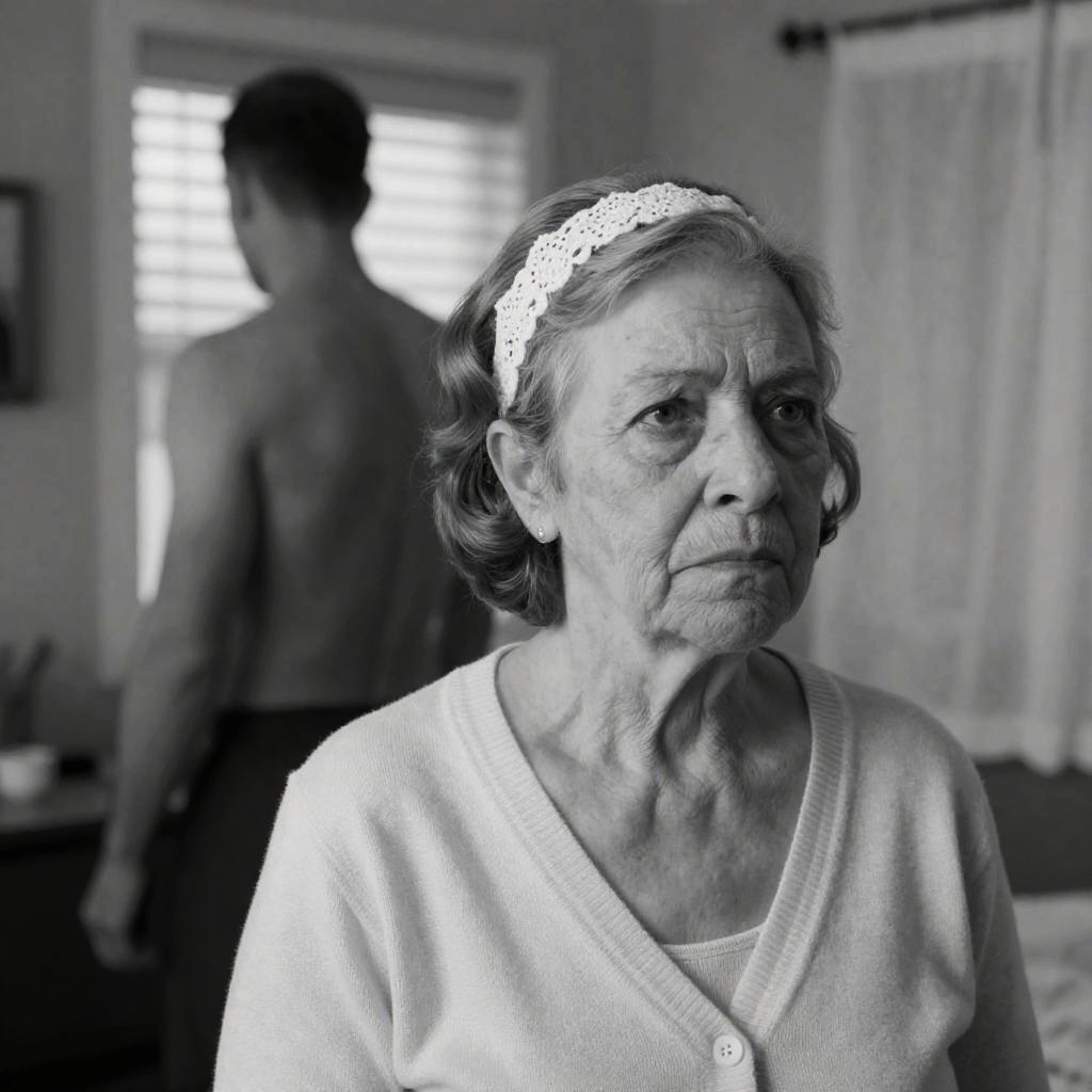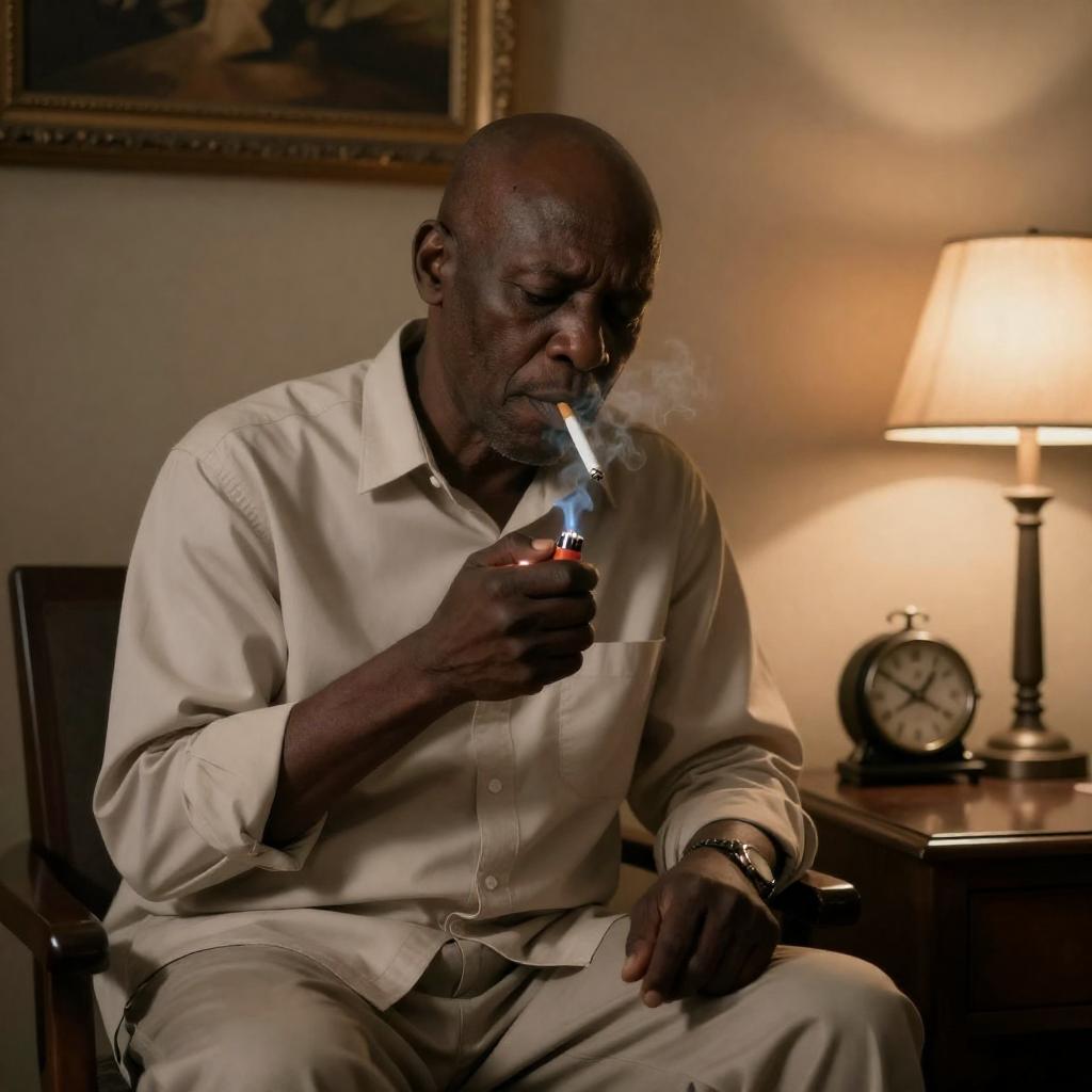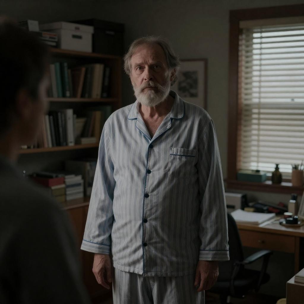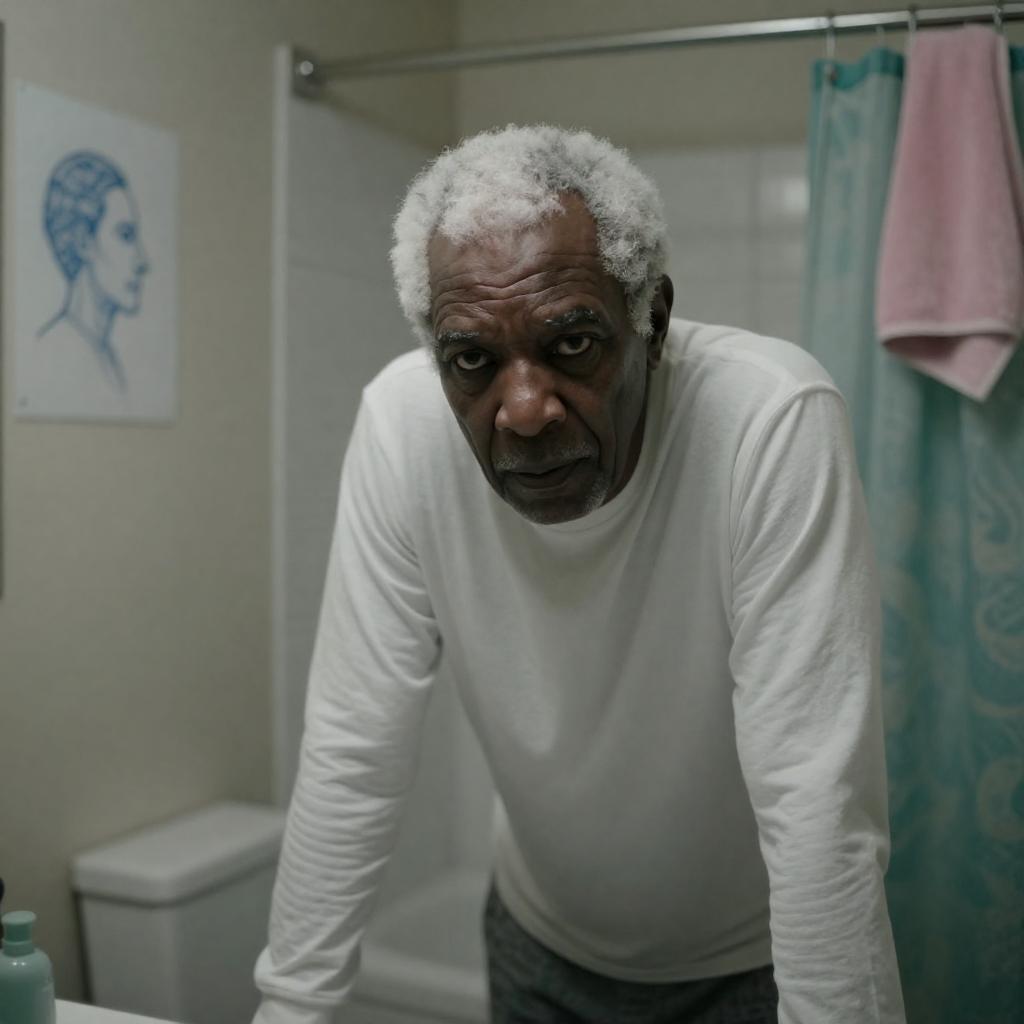 Old African American man with white hair, wearing white long-sleeve shirt, leaning forward, intense gaze, dimly lit bathroom, green patterned shower curtain, pink towel on right, blue sketch of profile on left wall.