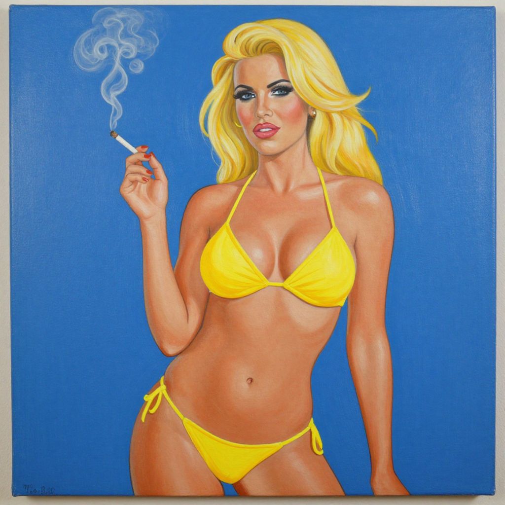 Digital painting of a blonde woman with blue eyes, wearing a yellow bikini, smoking a cigarette against a bright blue background.