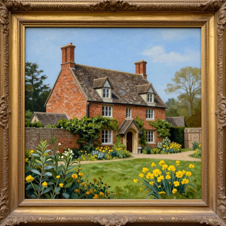 A serene Victorian-era Yorkshire home bathed in the warm glow of interior lights contrasts against the muted twilight sky, rendered in a classic oil painting style reminiscent of John Atkinson Grimshaw's \"In the Gloaming,\" with enhanced lighting effects and a vintage aesthetic.