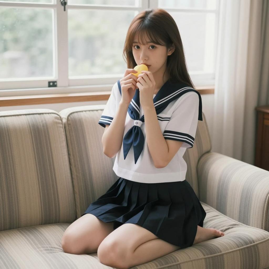 Asian woman with long black hair and bangs, wearing a navy blue sailor school uniform, sits on a wooden desk. She drinks from a yellow soda bottle, holding an orange slice in her other hand. Natural light from a window to her left. Beige curtains in the background. She looks directly at the camera with a neutral expression. She sits with her legs slightly apart and her right arm resting on the desk. Single person. Realistic photograph.
