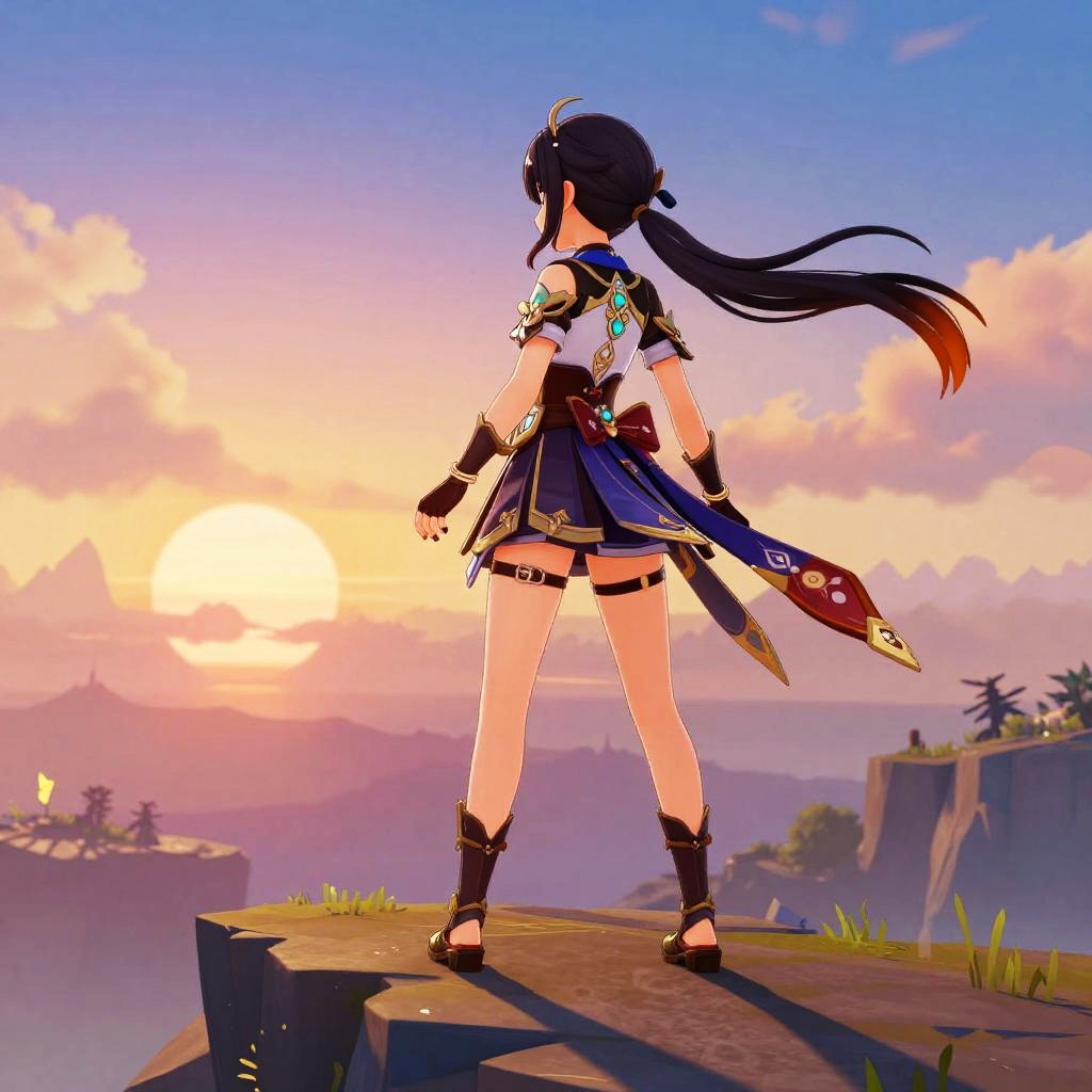 Genshin impact girl standing on a cliff at sunset, detailed anime style, vibrant colors, dynamic pose, flowing hair, mystical background