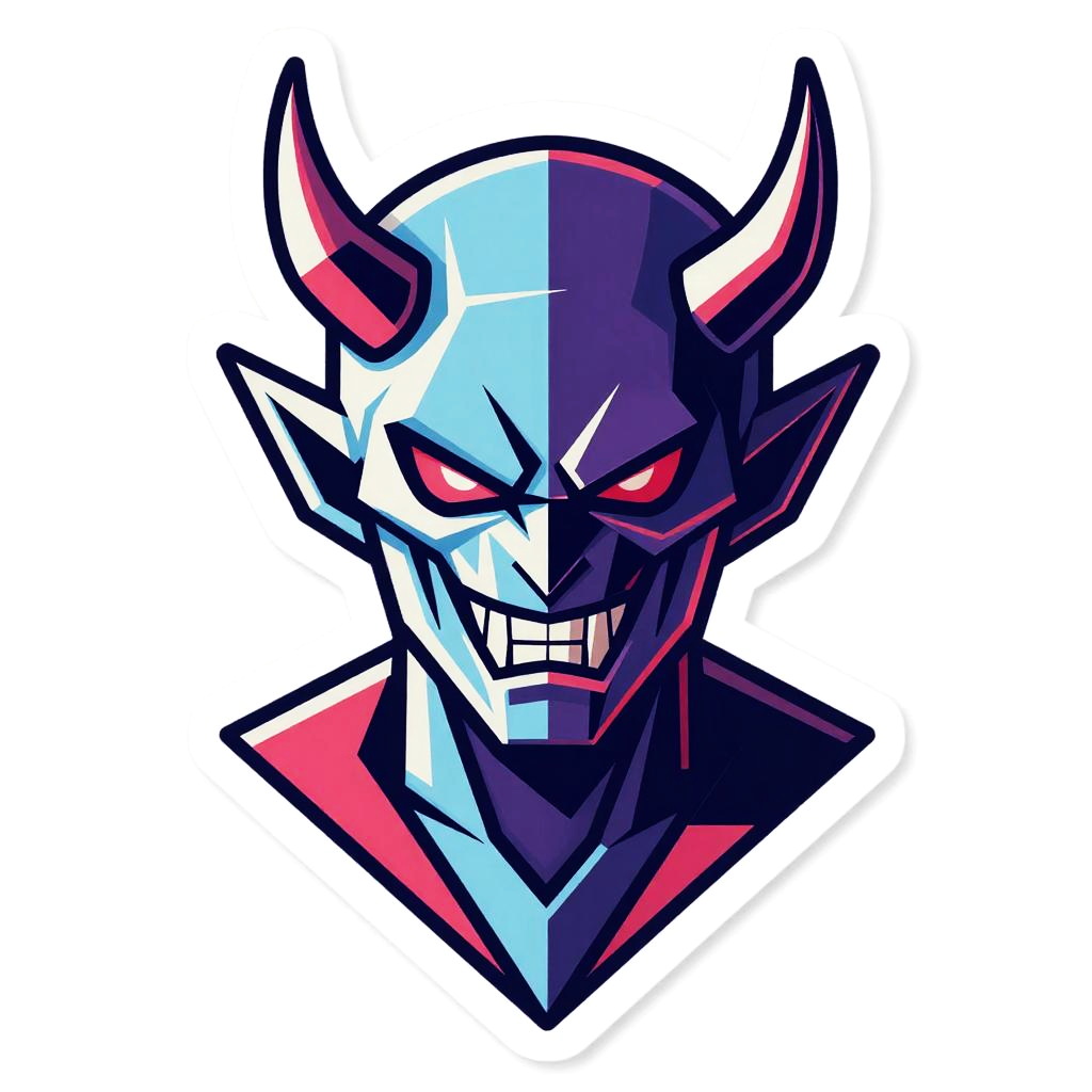 Mechashot Devil in sticker geometric art style, bold lines, angular shapes, edgy and futuristic design, vibrant colors, suitable for sticker or logo