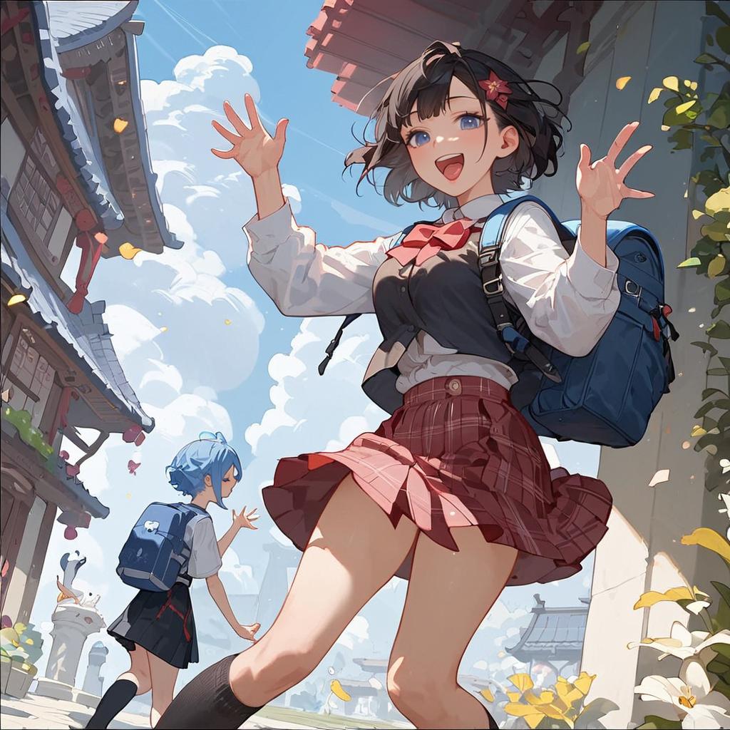 Score_9, score_8_up, score_7_up, source_anime, anime_screencap, 1girl, white shirt, black vest, blue backpack, plaid skirt, black socks, black footwear, open mouth, smile, both hands waving, cowboy shot, japanese city, noon