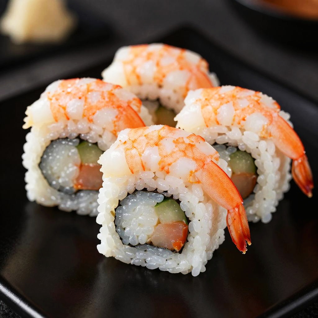 This close-up photo shows a plate of sushi rolls with bright orange shrimp, white rice, and dark green seaweed. The sushi rolls are arranged neatly on a shiny black surface, creating a reflective effect. The background is blurred, focusing attention on the vibrant colors and textures of the sushi. The shrimp's pinkish-orange hue contrasts beautifully with the white rice and dark seaweed.