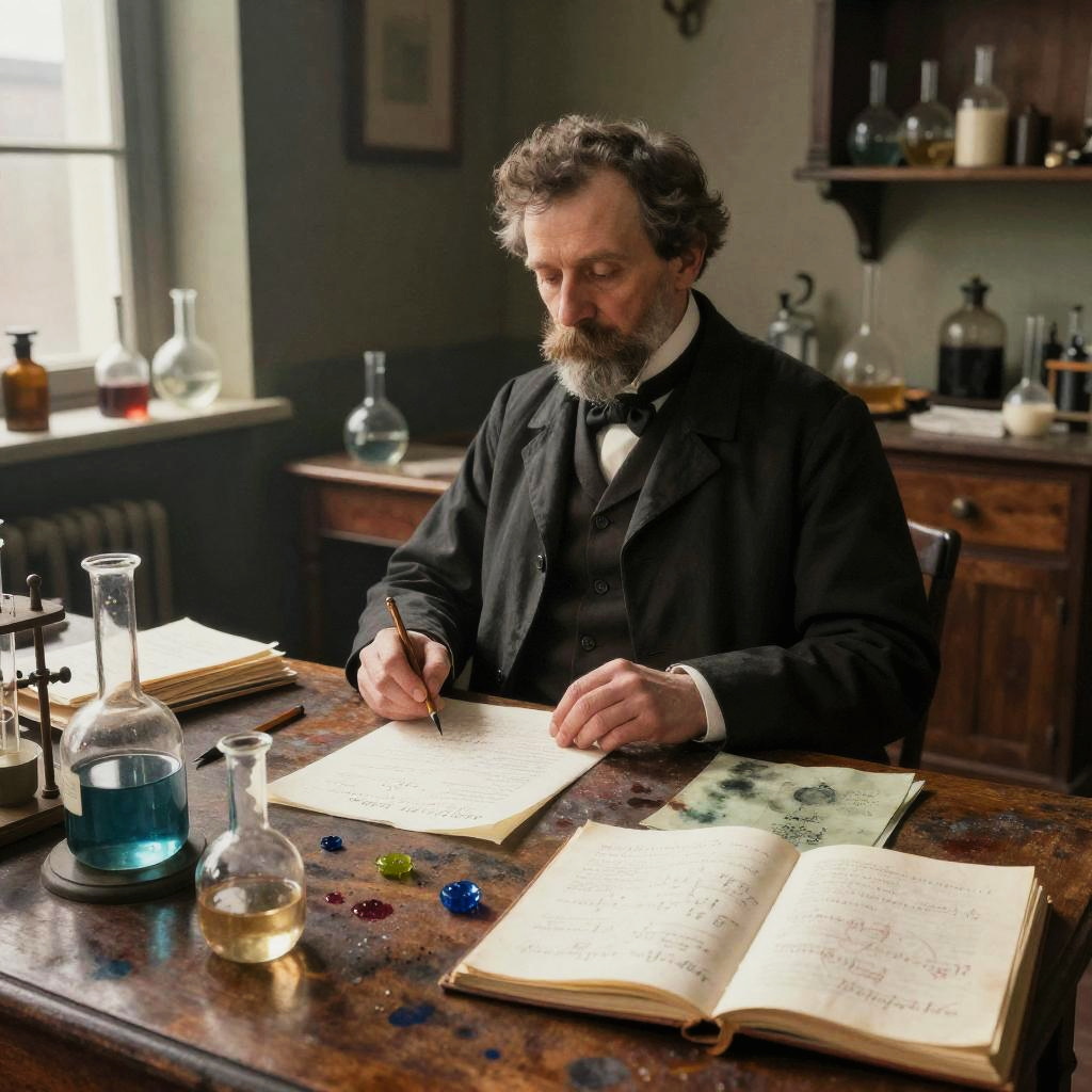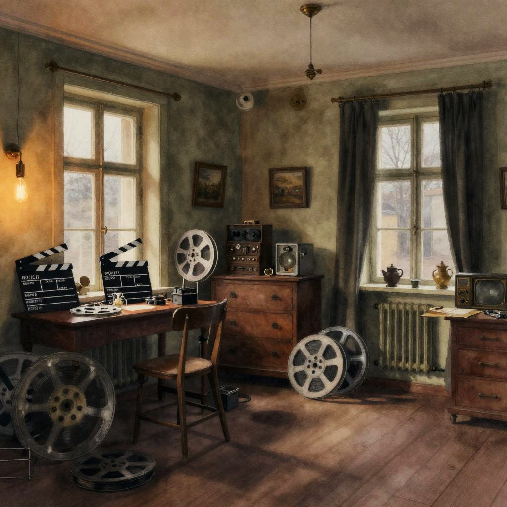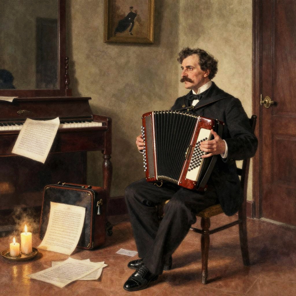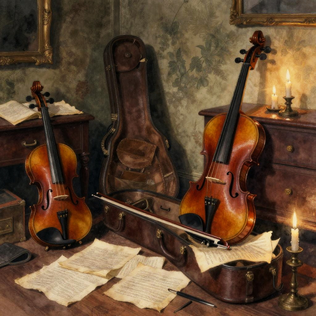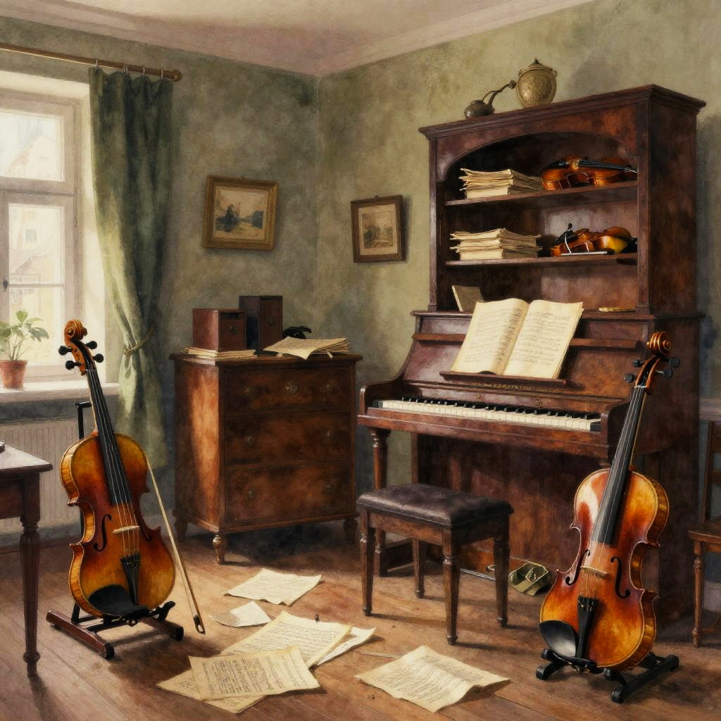 A room in an apartment of a Czech violinist at the beginning of the 20th century, dimly lit in the late evening. Everything is cluttered. wrinkled sheet music, violin stand, aged wood furniture, image in the style of watercolor