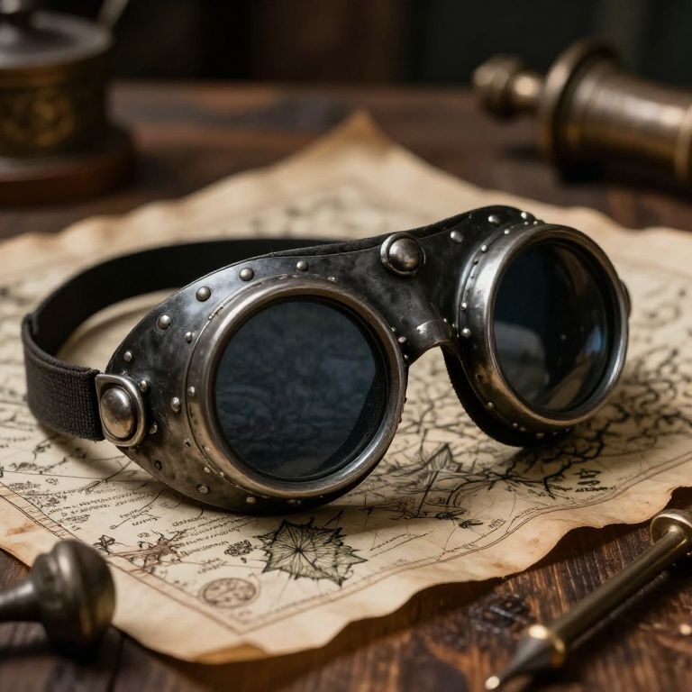 Medieval goggles illuminated by flickering torchlight, hanging from a leather strap near an alchemist's bubbling cauldron and ancient spellbooks in a shadowy stone chamber