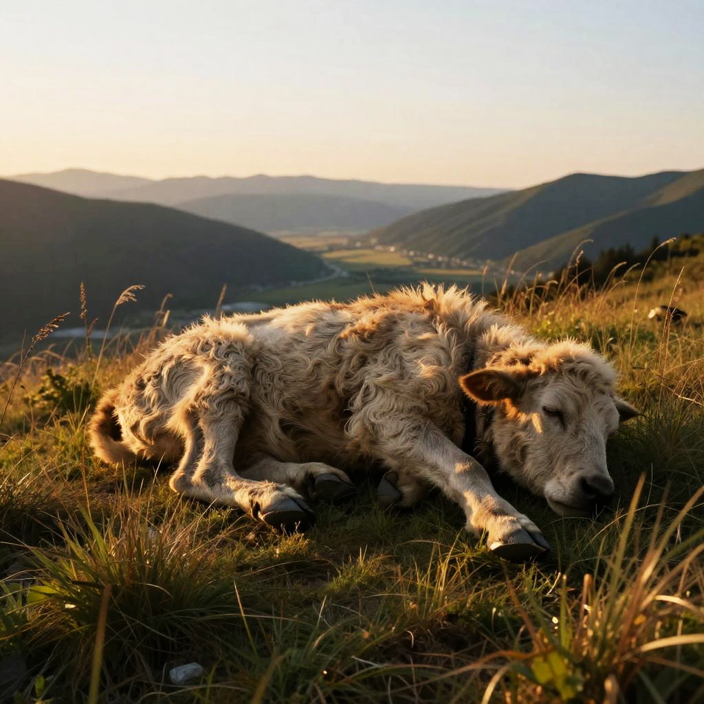 Dahu resting peacefully atop a grassy bluff overlooking a vast valley, bathed in golden hour light, intricate textures on its fur highlighting slight asymmetry in legs and body posture, framed by wild grasses and distant mountain silhouettes, invoking calm and wonder.