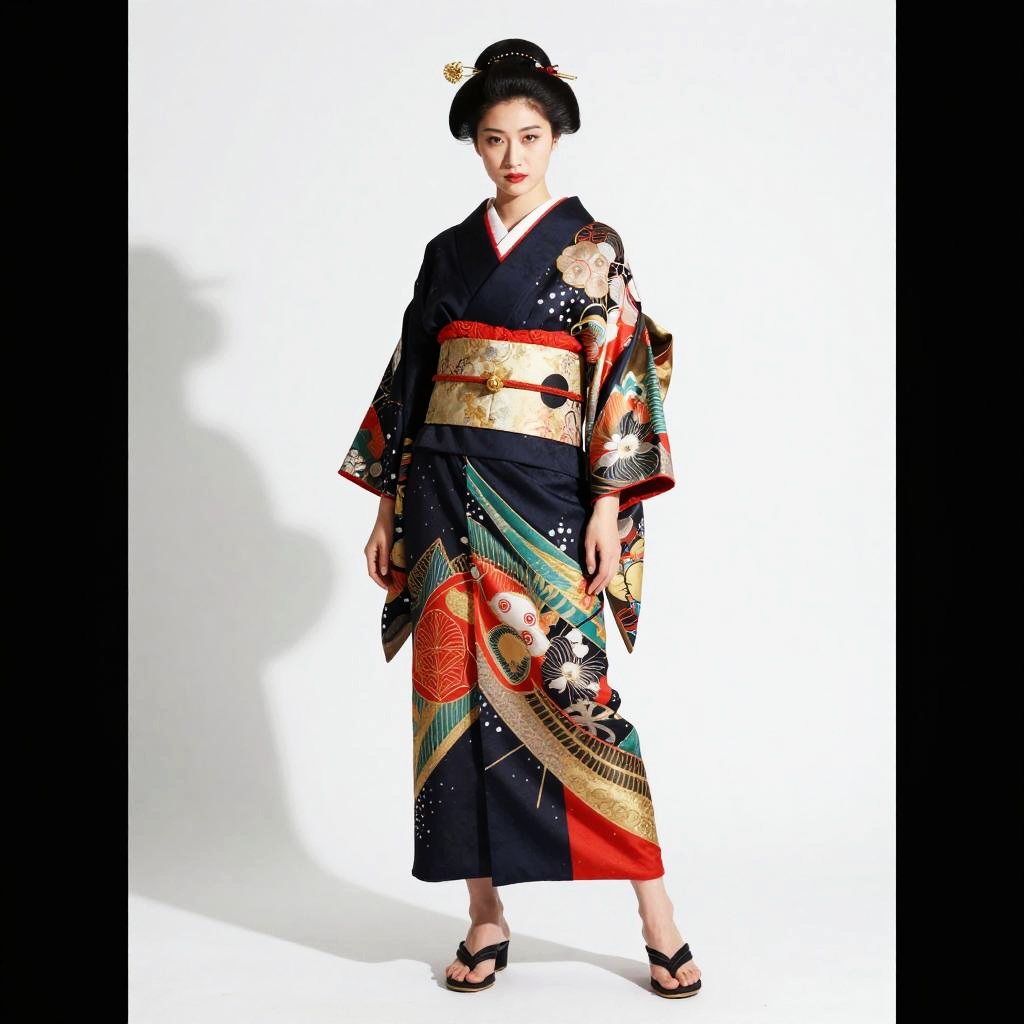 Japanese female model in avant-garde fashion, combining futuristic elements with classic Japanese motifs, standing against a stark white background, dramatic shadows and vibrant colors, a blend of tradition and innovation, artistic expression.