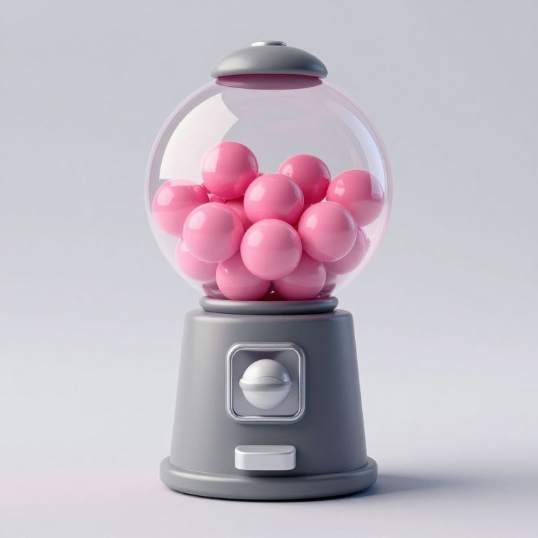 A sleek, modern 3D-rendered bubble gum dispenser features a cylindrical gray base and a transparent globe filled with vibrant pink gum balls, showcasing a clean, minimalist aesthetic with high-definition detail and realistic lighting effects.