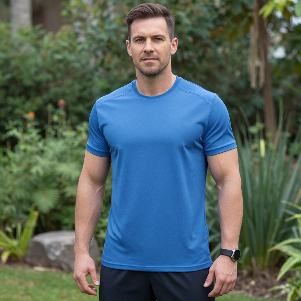 "Gym Sportswear, a man in a blue shirt is standing in a garden"