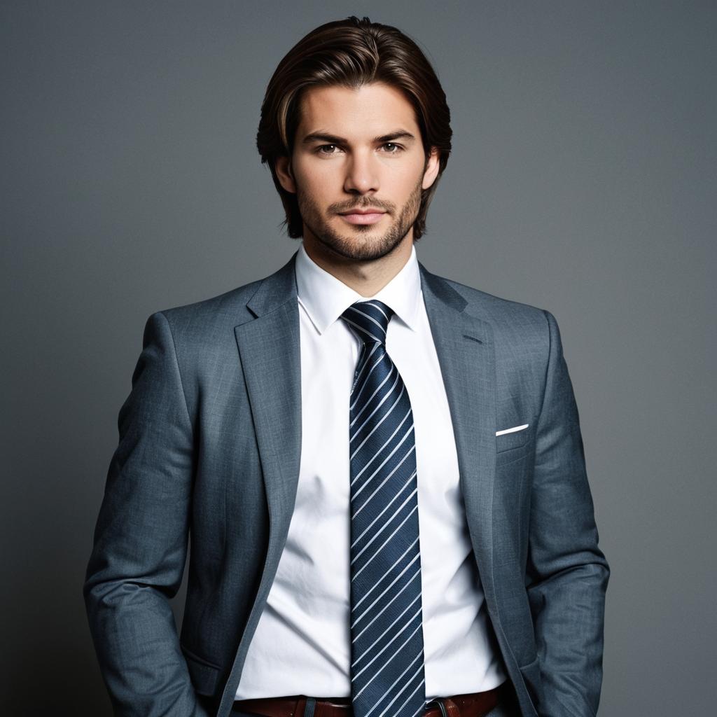 Portrait of a confident young man with brown hair and light facial hair wearing a grey business suit and a blue striped necktie. He is dressed in a white collared shirt, grey suit jacket, and grey pants, standing against a plain grey background looking directly at the viewer.
