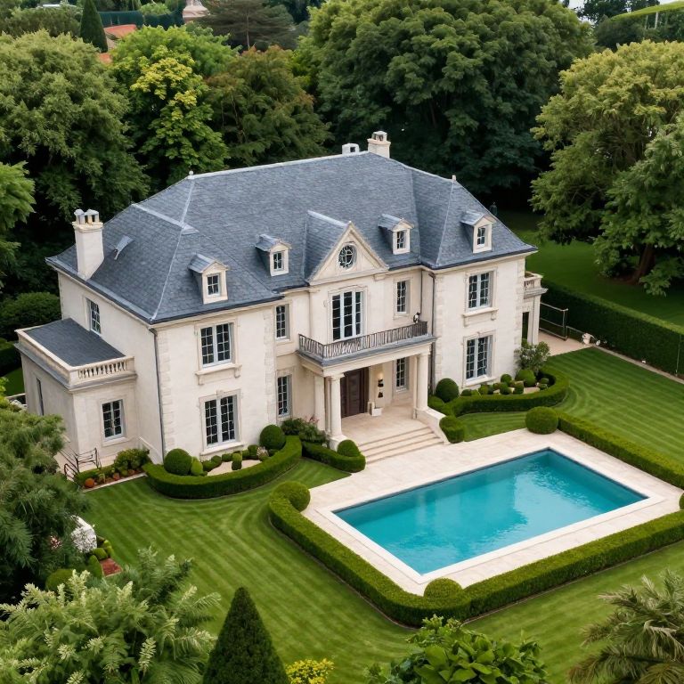 Elevated perspective reveals a grand mansion with light-toned exterior walls and dark gray slate roofing, surrounded by meticulously manicured green lawns, circular topiary hedges, and a rectangular swimming pool with a stone deck, all nestled amidst a dense backdrop of tall, lush trees.