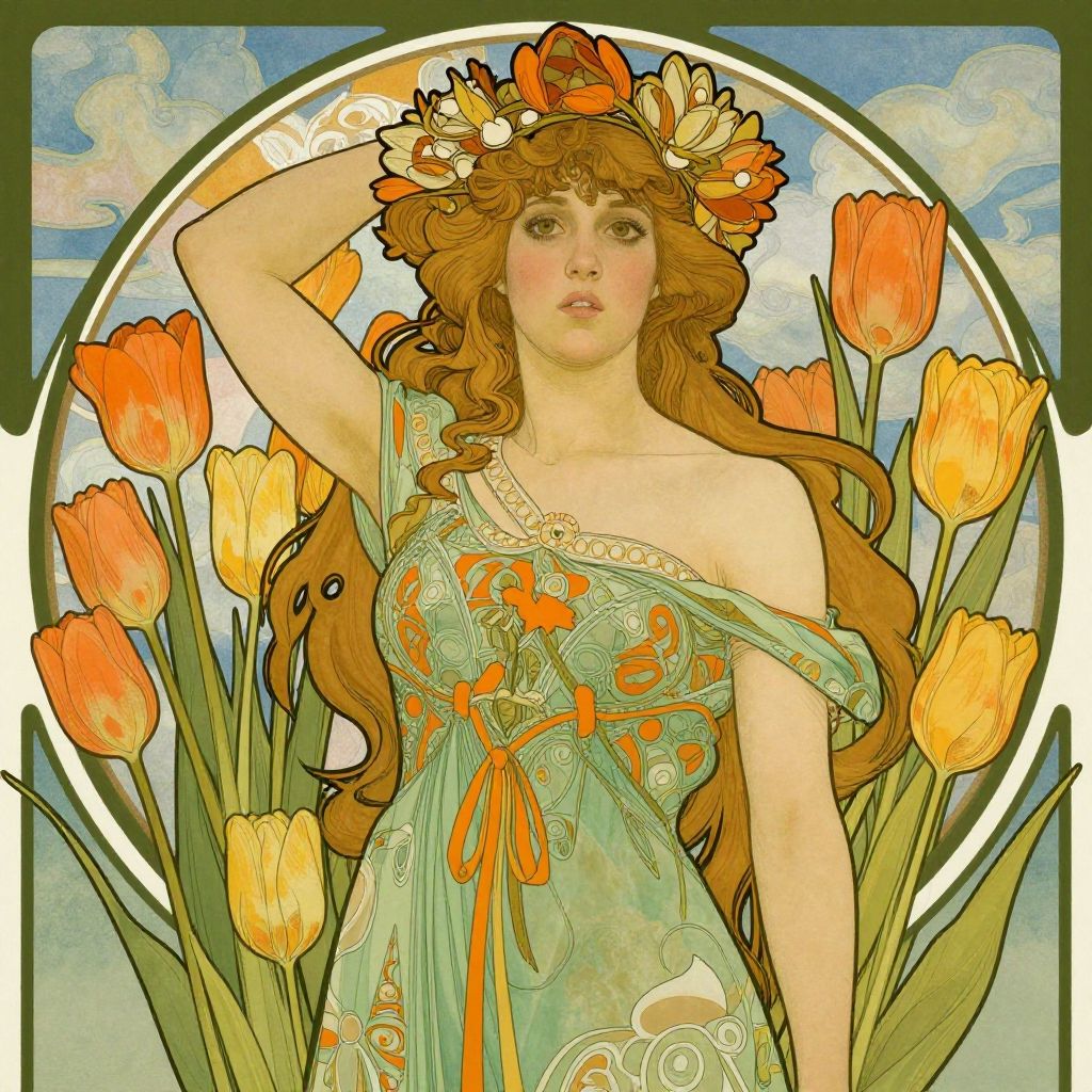 An Art Nouveau style illustration inspired by Alphonse Mucha, featuring a graceful half-body woman with medium-length wavy blonde hair and expressive features. She wears a decorative green dress with orange accents and a floral crown of tulips. The background includes a green circular frame, a serene sky with soft clouds, and vibrant orange and yellow tulips surrounding her. The artwork emphasizes intricate botanical details and a harmonious color palette.
