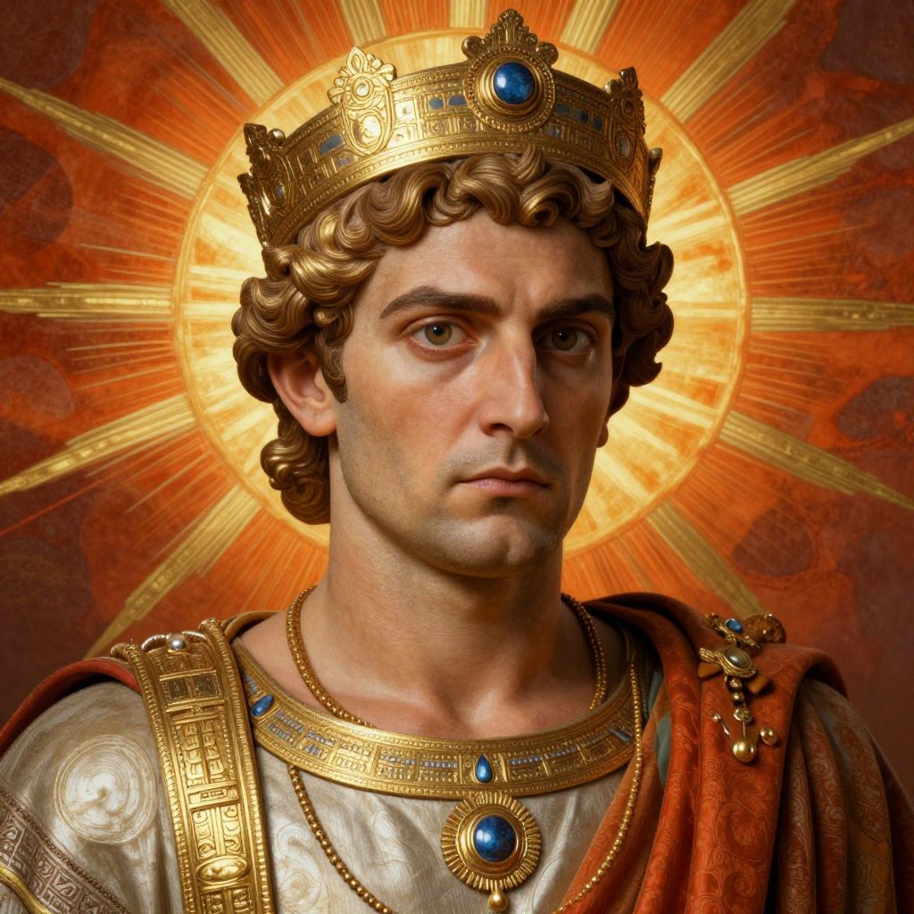 Elagabalus, stylized portrait of the controversial Roman emperor with expressive, intense gaze, surrounded by symbols of solar deity Elagabal, rich color palette blending reds, oranges, and golds, ornate jewelry and ceremonial robes, evocative and powerful