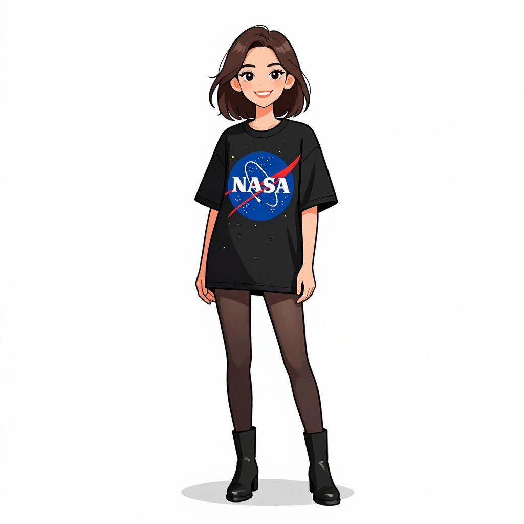 This digital anime-style illustration features a young woman with fair skin, shoulder-length dark brown hair, and large, expressive brown eyes. She stands confidently against a plain white background. She wears a black NASA T-shirt with a blue, red, and white NASA logo, short black tights, and black ankle boots. Her facial expression is friendly and slightly smiling. The art style is clean with bold lines and bright colors, emphasizing simplicity and modernity. The woman's outfit and casual stance give her a relaxed and approachable appearance.
