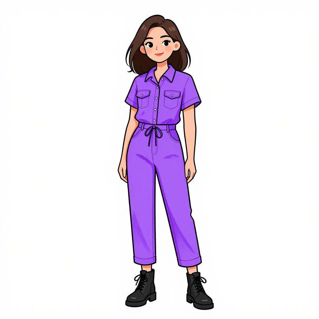 Woman with pretty face and pretty hair. smiling Woman, utilitarian chic, olive green jumpsuit with button-up front, flap pockets on chest and hips, tailored waist, long sleeves with buttoned cuffs, wide-leg pants, minimalist black ankle boots, no visible jewelry, clean bun, plain white studio background --sref 1467