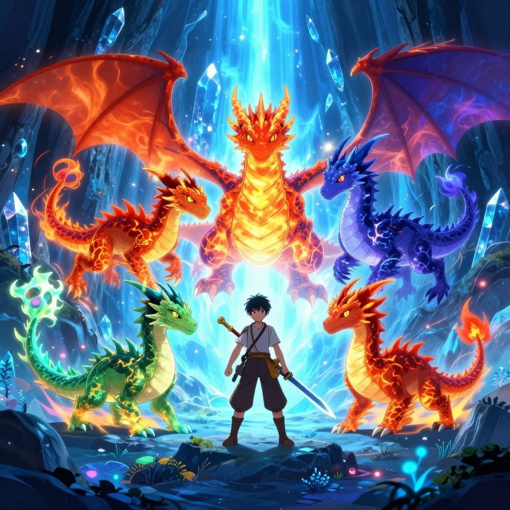 A vibrant digital anime-style illustration depicts a dark-haired adventurer with a sword, standing at the center of a glowing, cavernous environment. Surrounding him are five colorful dragons: a fiery red one with wings spread wide, a blue dragon to its right, a green dragon to the left, and two smaller red dragons. The dragons emit bright, contrasting colors, while the cavern is illuminated by a radiant blue light from above. The adventurer's attire includes a white shirt and brown pants, and he stands with a determined posture. The background features jagged rock formations and glowing crystals, adding a mystical ambiance.
