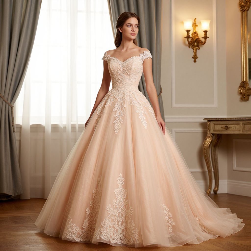 Photograph of a fair-skinned woman in an elegant, long-sleeved, lace-embellished, peach-colored ball gown, standing in