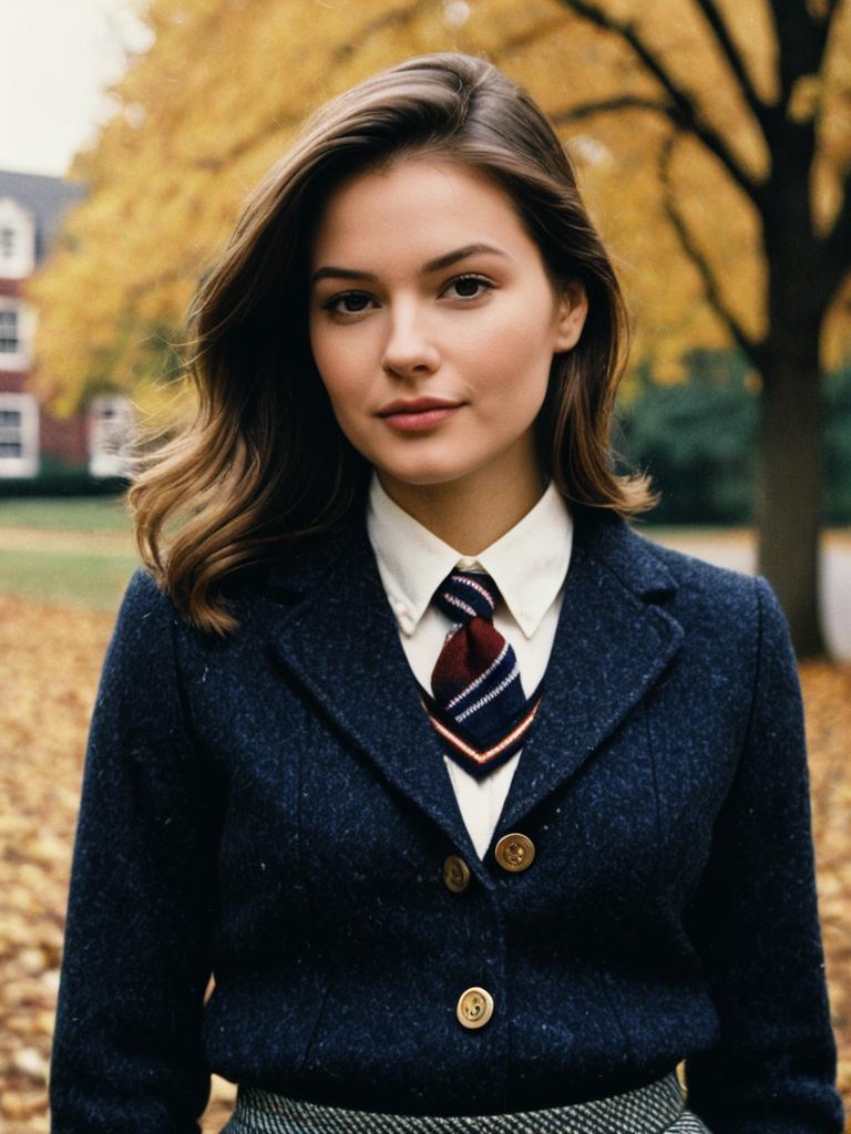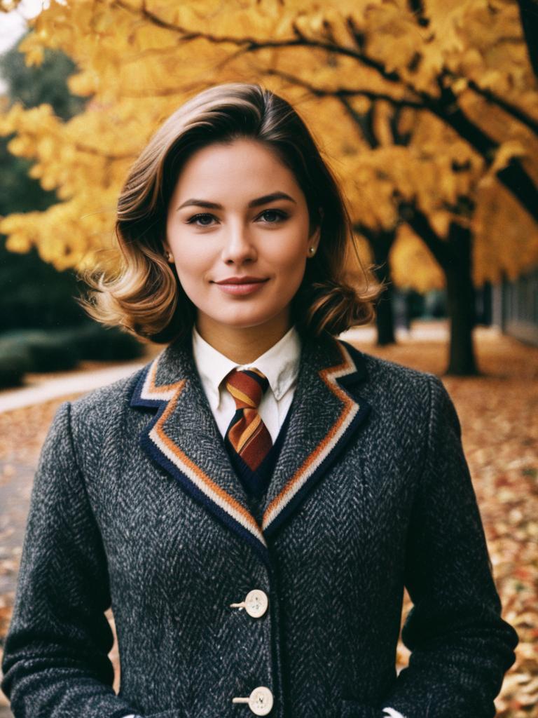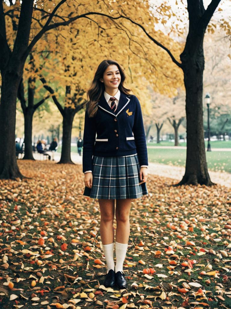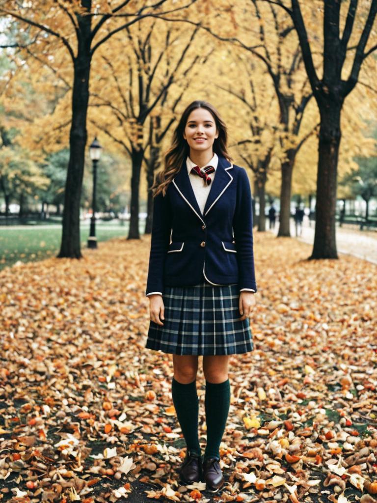 Woman in Preppy Fall Outfit, full-body photo in park with falling leaves