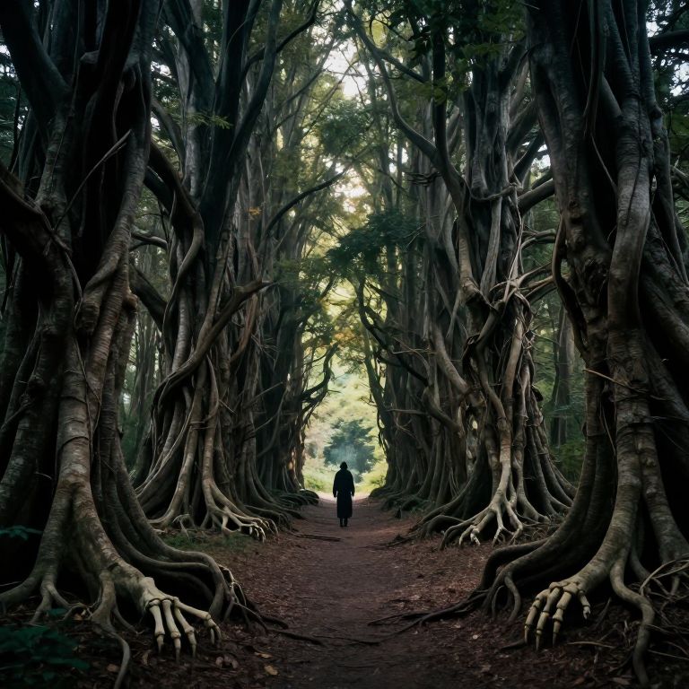 A lone figure traverses a mystical forest path flanked by towering, gnarled trees whose roots stretch like skeletal fingers, casting an otherworldly glow that defies the natural order.