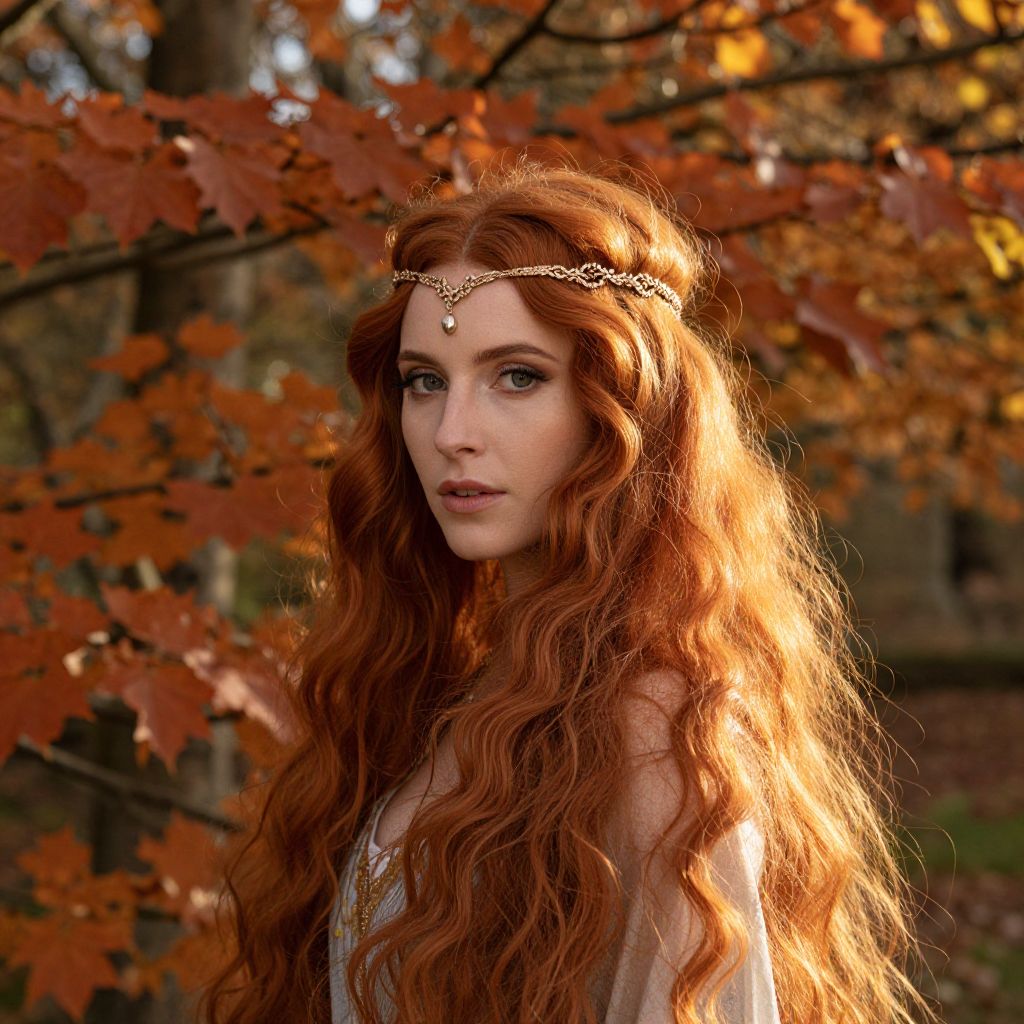 Autumnal sunlight bathes a vibrant scene featuring a woman with cascading red hair adorned with a delicate gold headpiece, set against a backdrop of rust-colored leaves and golden foliage, evoking a mystical elven ambiance in a London woodland setting.