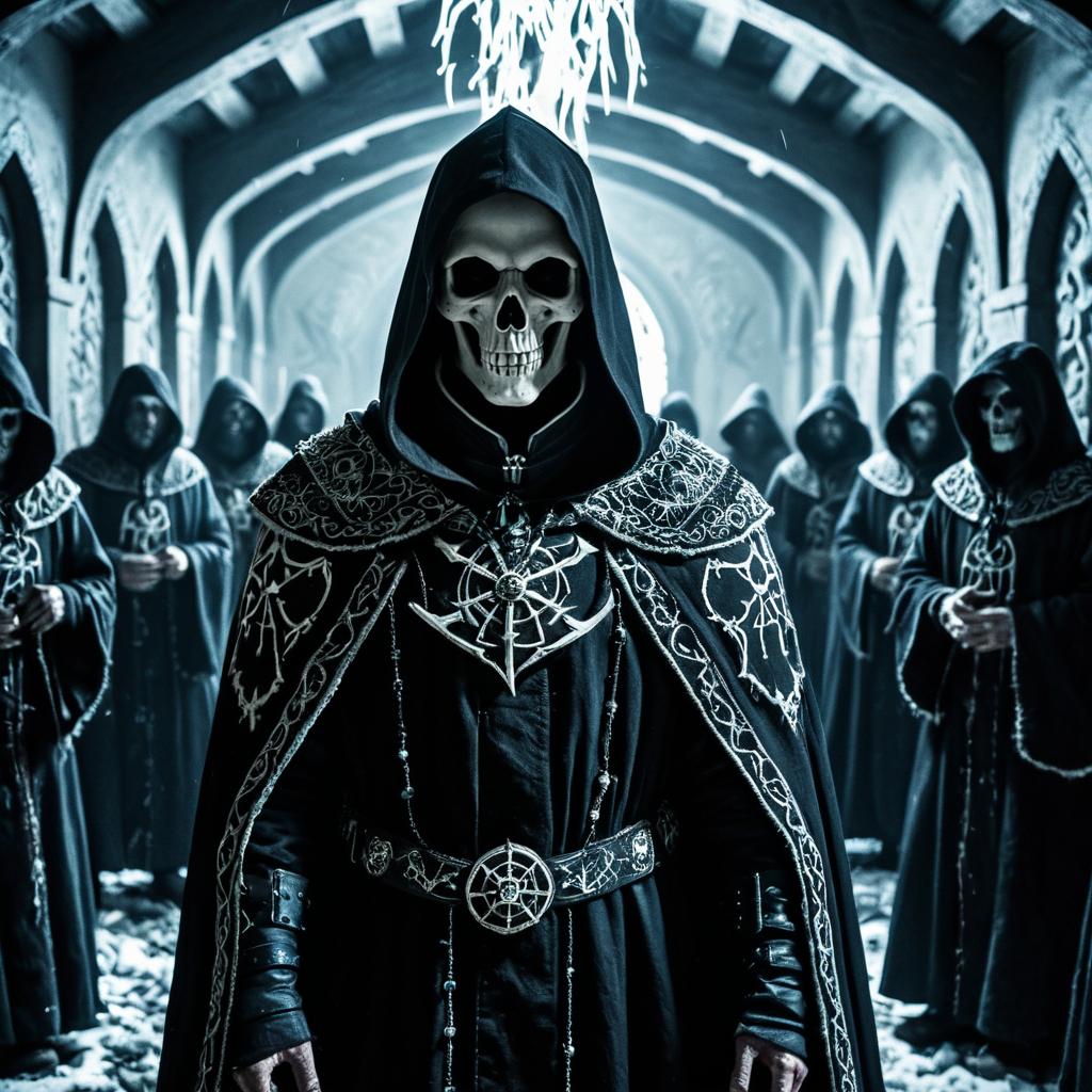A gothic cultist wearing a black hollow hooded mantle intricately embroidered with white bone fragments stands in the center of a dimly lit, arched hallway filled with shadowy hooded figures. The mantle features skeletal designs with a prominent cross necklace and decorative chains. The surrounding space is cold and icy, with sparks and snow-like particles floating in the atmosphere, enhancing the eerie, eldritch horror ambiance under cinematic lighting.
