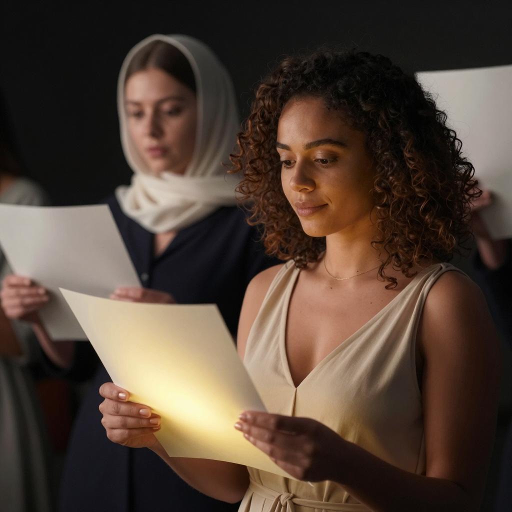 Photograph of a theater performance. Central female dancer in white dress with large black Afro, arms raised. Male dancer in white shirt, blonde curls, hands on hips, eyes closed. Audience applauds, diverse crowd. Balcony with red curtains, people watching. Male in black suit on left, beige turban. Diverse ages, expressions of joy. Warm, dim lighting. Ornate balcony railing.