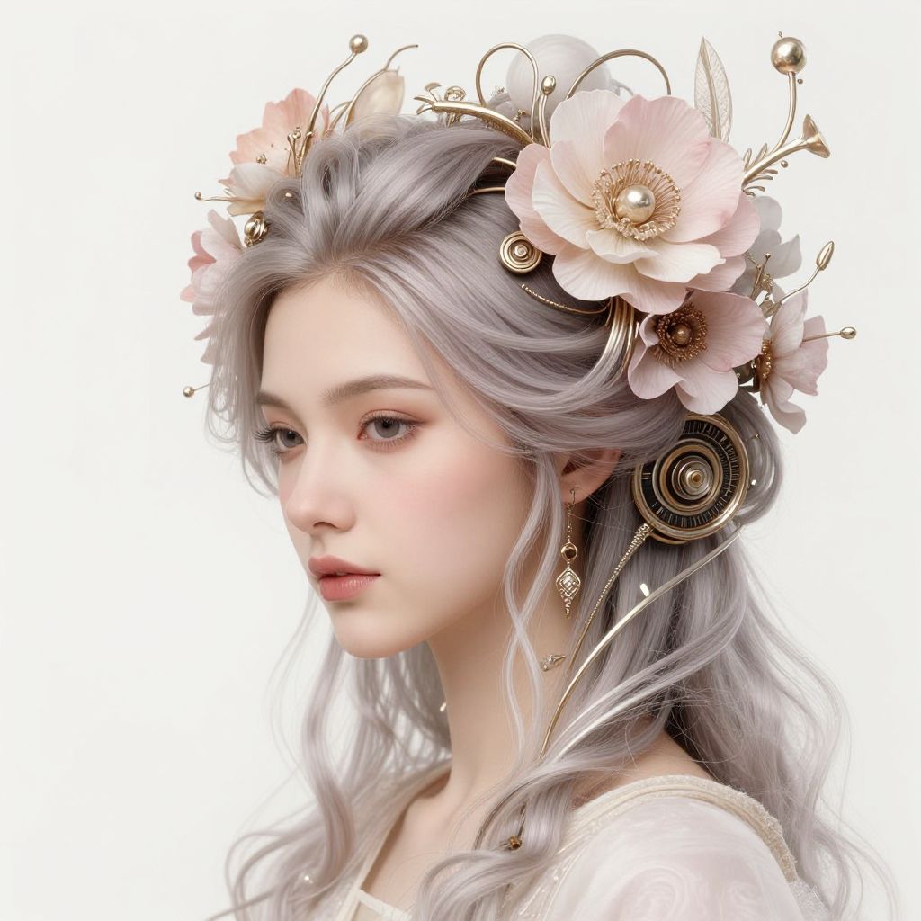 This digital artwork depicts a young woman with pale, porcelain skin and delicate, light gray hair adorned with large, pink roses and intricate, gold metallic floral and circular accents. Her eyes are downcast, giving her a pensive expression, and she wears a white, slightly translucent blouse. The background is plain white, emphasizing the subject. Her makeup is minimal, enhancing her natural beauty. The image has a soft, ethereal quality, with smooth textures and a fantasy-like aesthetic. The style is highly detailed and realistic, with a focus on delicate, feminine beauty and natural elements.